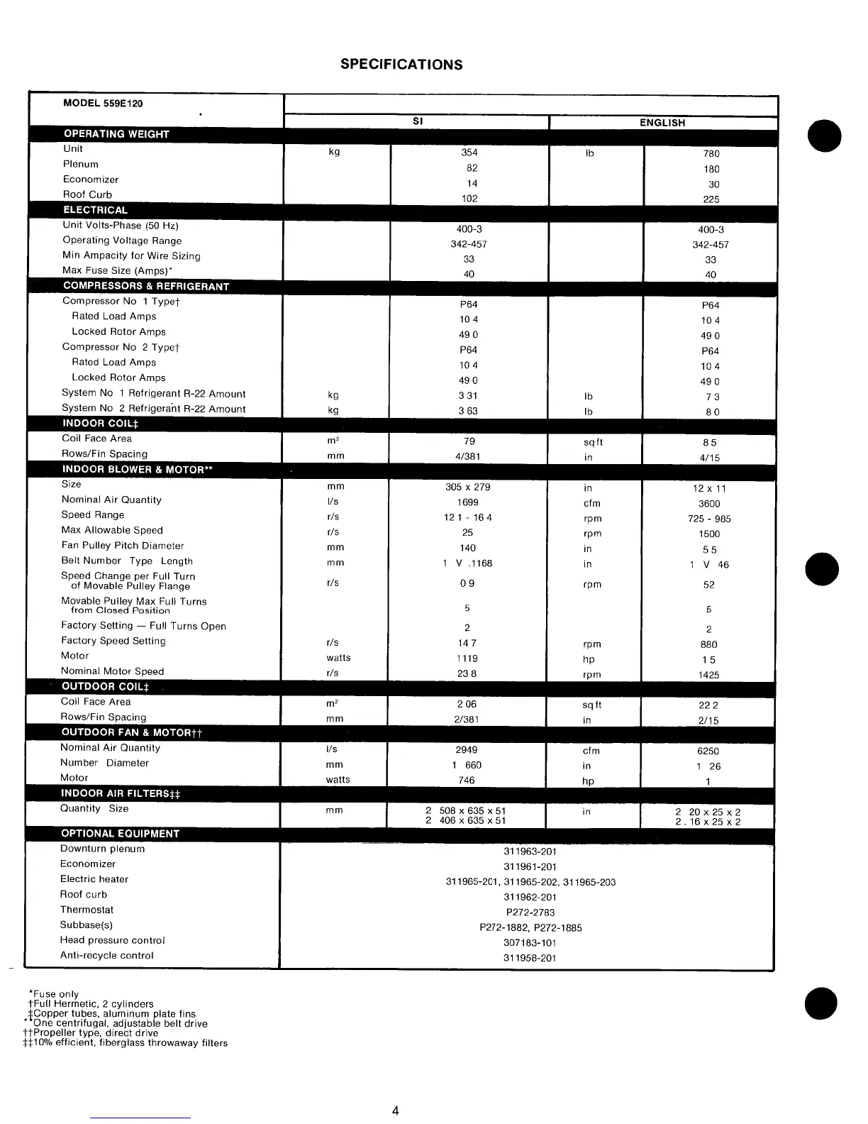 Bryant 559E - Model 559 E120 Specifications; Electrical and Refrigerant Specifications; Indoor and Outdoor Coil Specifications; Fan and Motor Specifications