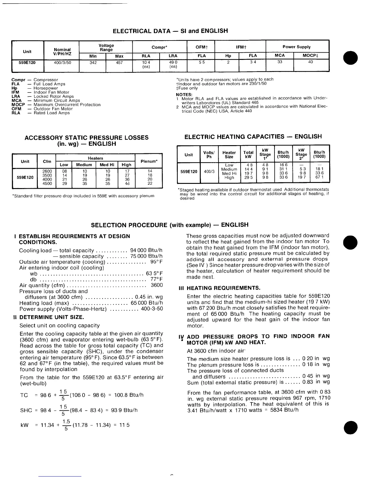 Bryant 559E - Heating and Electrical Data; Electric Heating Capacities; Accessory Static Pressure Losses