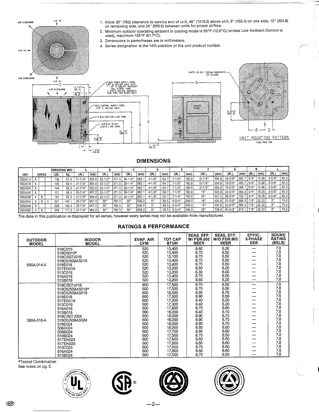 Bryant 590A - DIMENSIONS AND PERFORMANCE RATINGS; Unit Dimensions and Weights; Performance Data