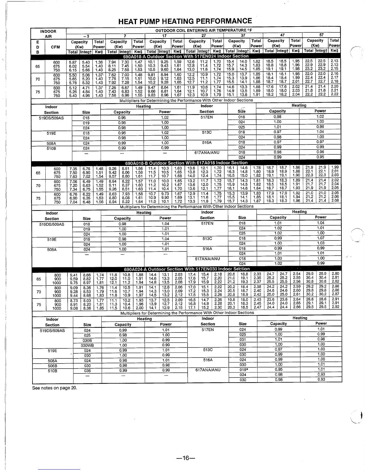 Bryant 690A - Heat Pump Heating Performance; Outdoor Coil Entering Air Temperature °F; Multipliers for Determining Performance With Other Indoor Sections