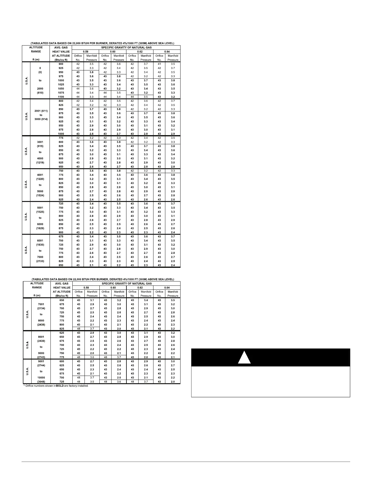 Table 11 – Orifice Size* and Manifold Pressure (In. W.C.) for Gas
