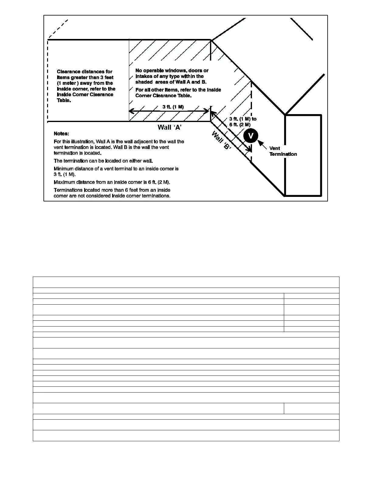 No operable windows, doors or intakes of any type are permitted on Wall B between the vent termination and the inside corner when the vent