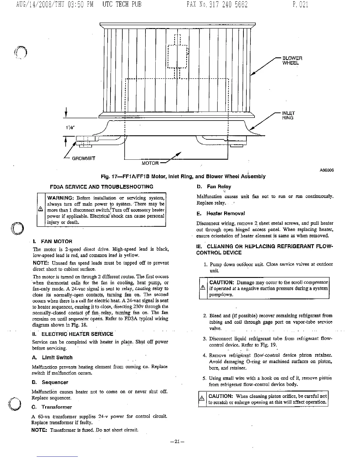 Bryant FA4A - FD3 A Service and Troubleshooting Procedures; FD3 A Fan Motor Service; FD3 A Electric Heater Service