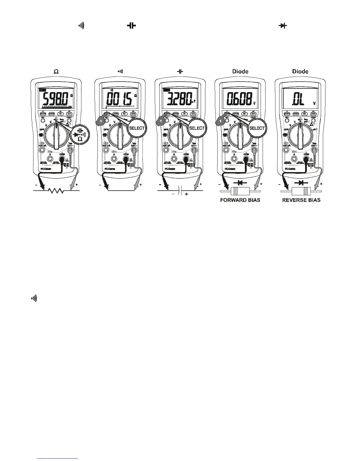 Resistance, Continuity, Capacitance (model 257, 255 & 252 only), & Diode test