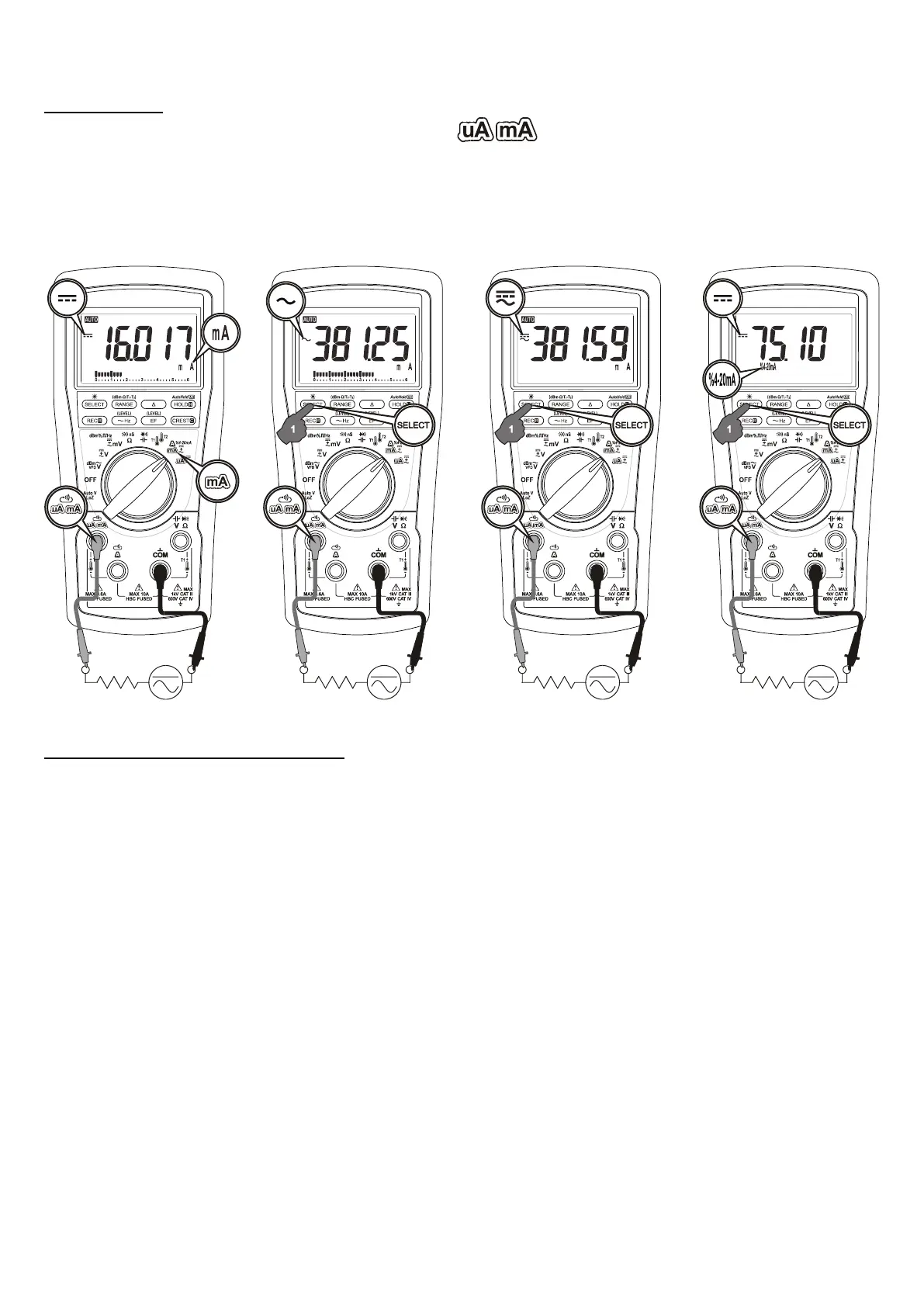momentarily to select DC, AC, DC+AC and %4-20mA (Model 789 only) in sequence.