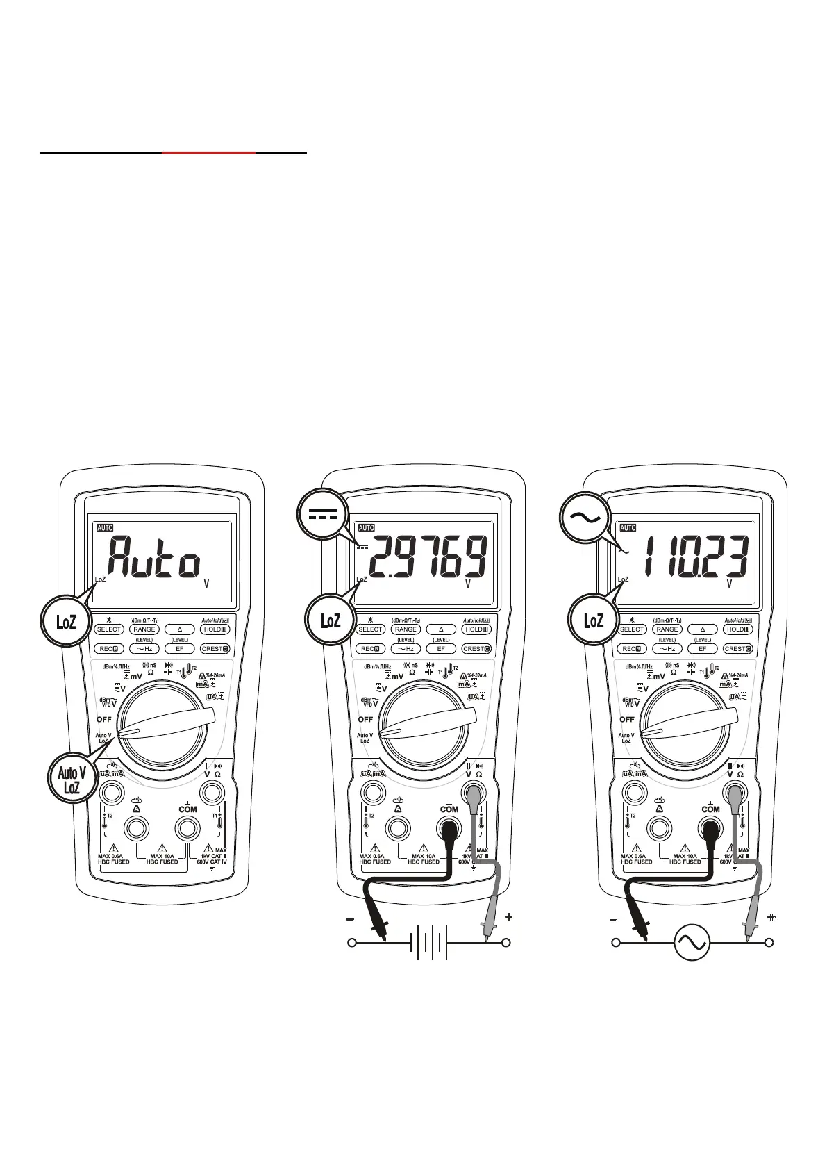 Inputs are made via the test lead terminals V-COM. AutoV automatically selects