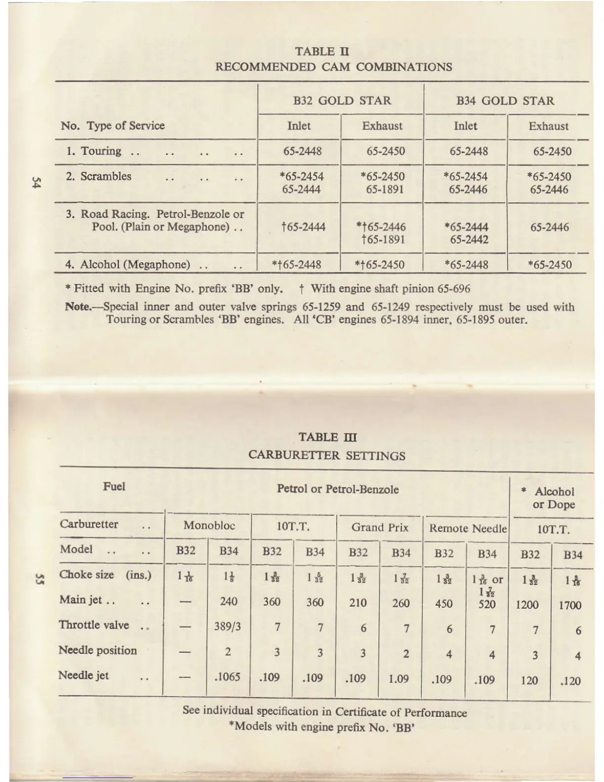 BSA B31 - Recommended Cam Combinations; Carburetor Settings