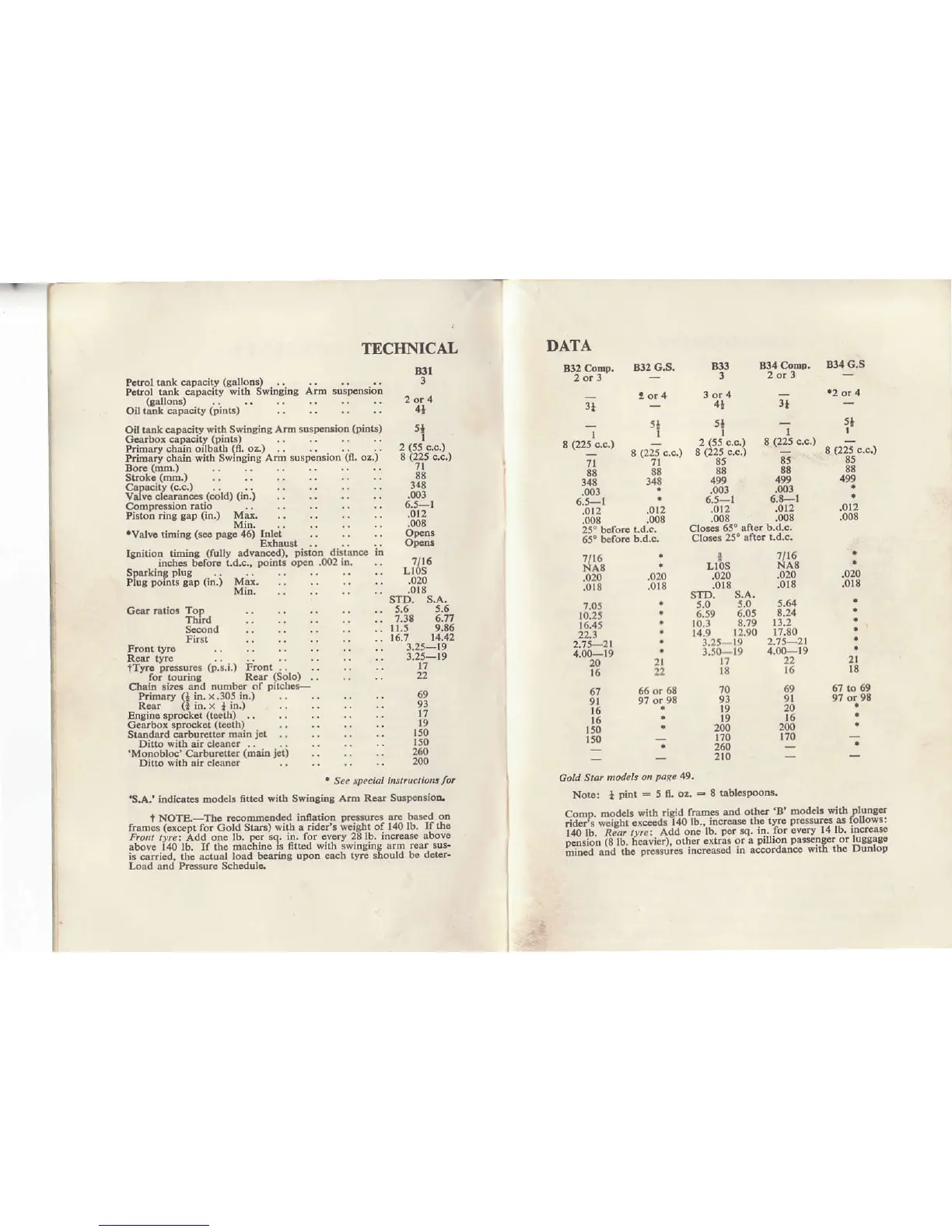 BSA B31 - Motorcycle Overview and Controls; Technical Data