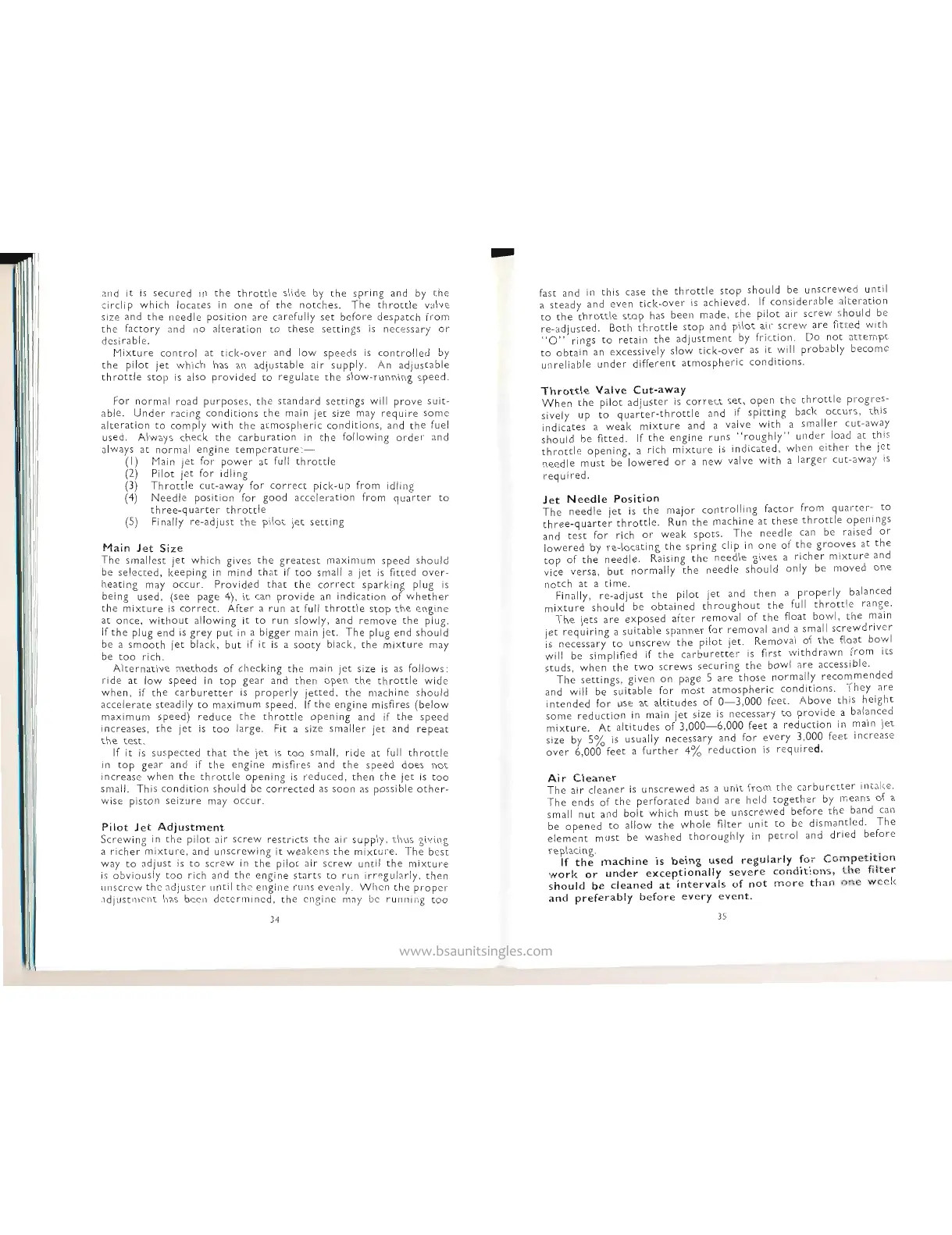 BSA B44 - Carburetter Adjustments; Main Jet and Pilot Jet Settings; Jet Needle and Air Cleaner Service