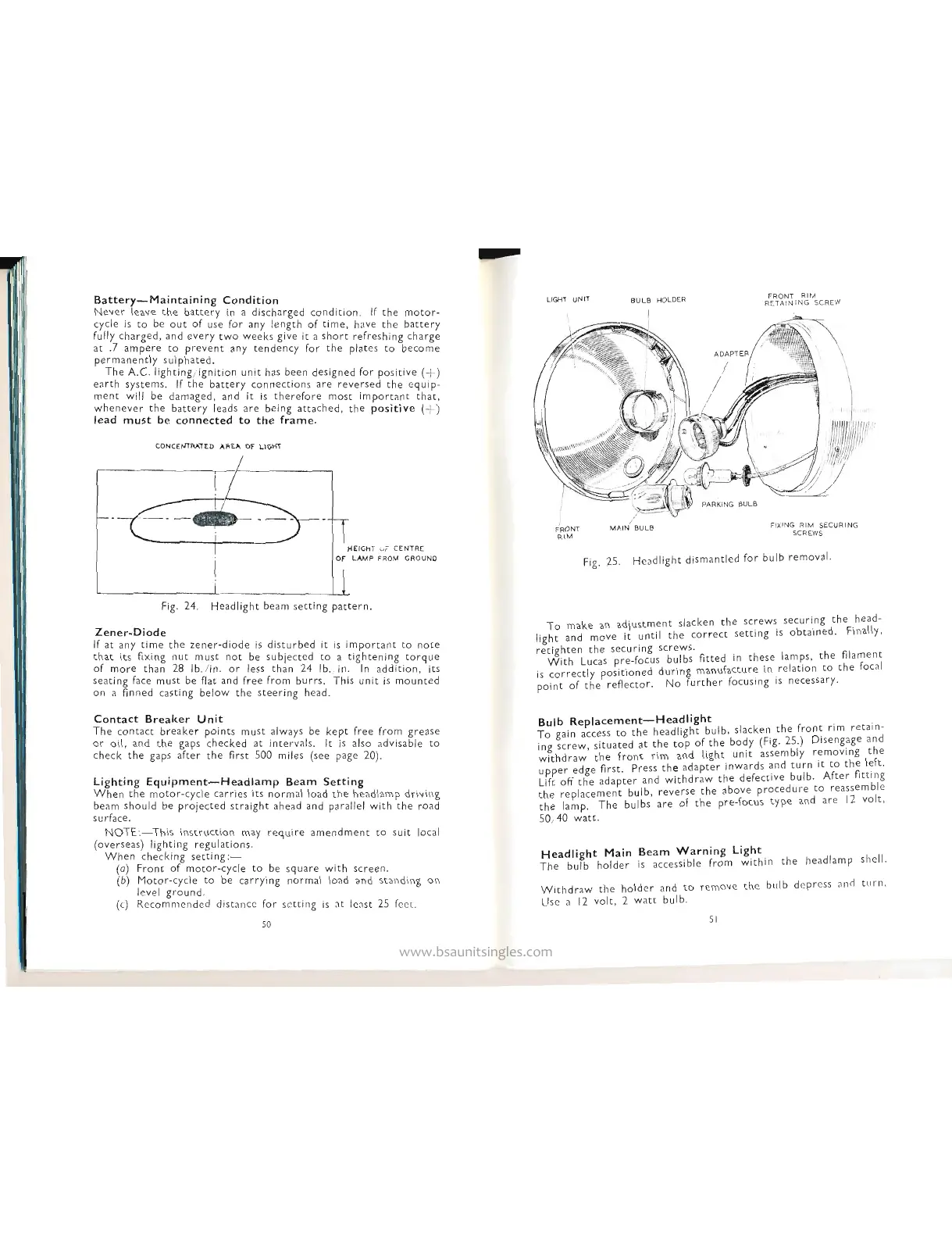 BSA B44 - Battery and Headlight Maintenance; Battery Topping-up and Zener-Diode; Headlight Beam Setting and Bulb Replacement