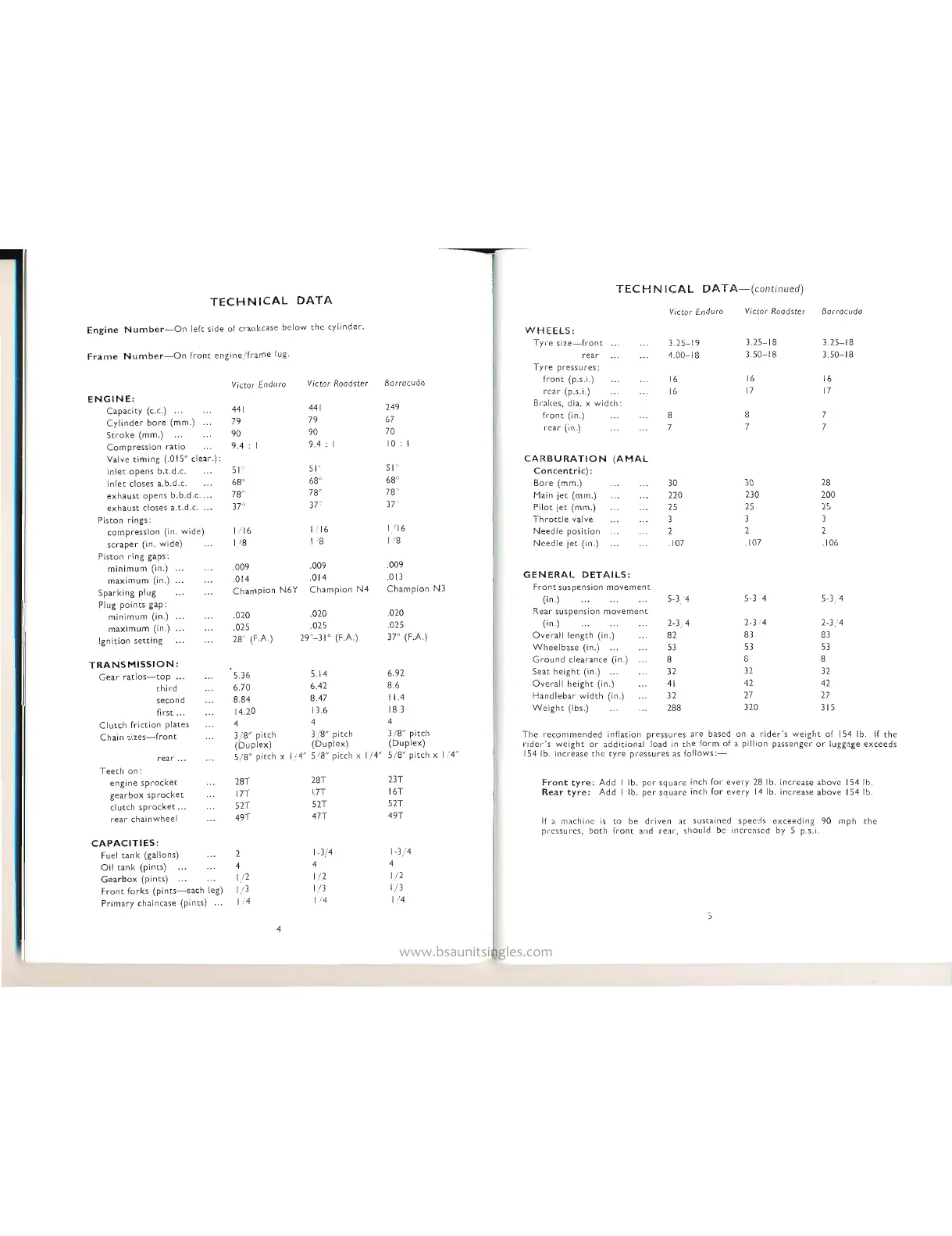 BSA B44 - Technical Data; Engine and Transmission Specifications; Wheel, Carburettor, and General Details