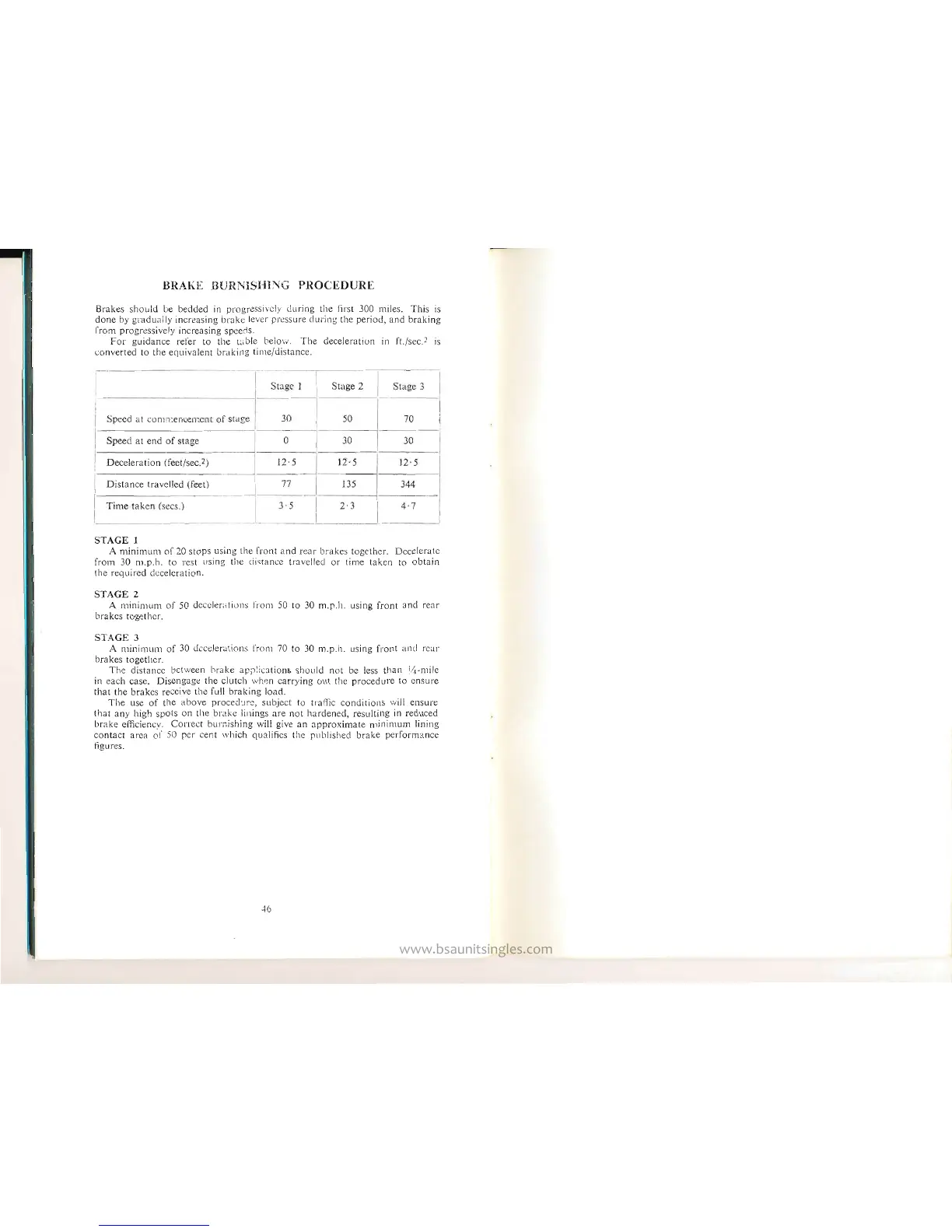 BSA b50 series - Brake Burnishing Procedure; Brake Burnishing Stage 1; Brake Burnishing Stage 2; Brake Burnishing Stage 3