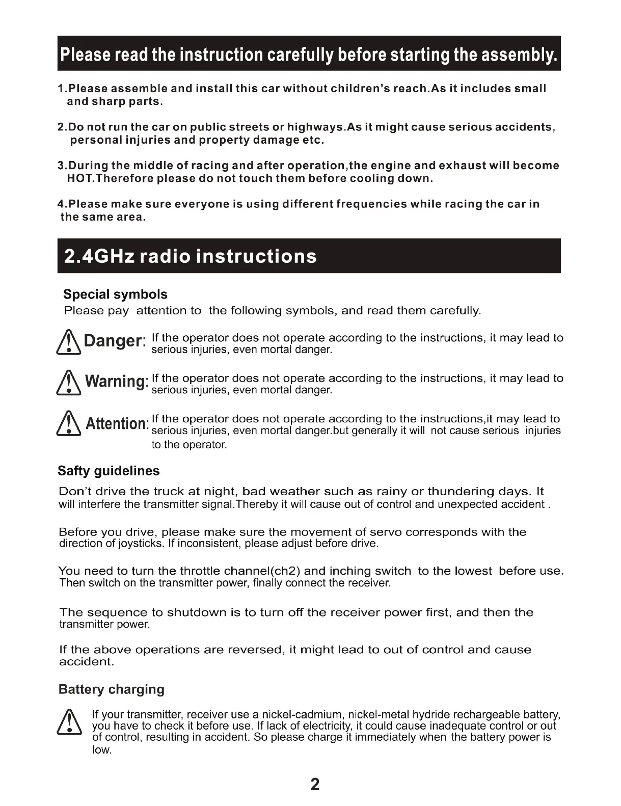 BSD-Racing Ramasoon - 2.4 GHz Radio Instructions; Special Symbols and Safety Guidelines; Battery Charging Safety