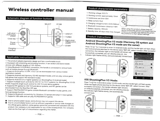 BSP D8 - Wireless Controller Manual Overview; Schematic Diagram of Function Buttons; Android ShootingPlus V3 Mode; iOS ShootingPlus V3 Mode