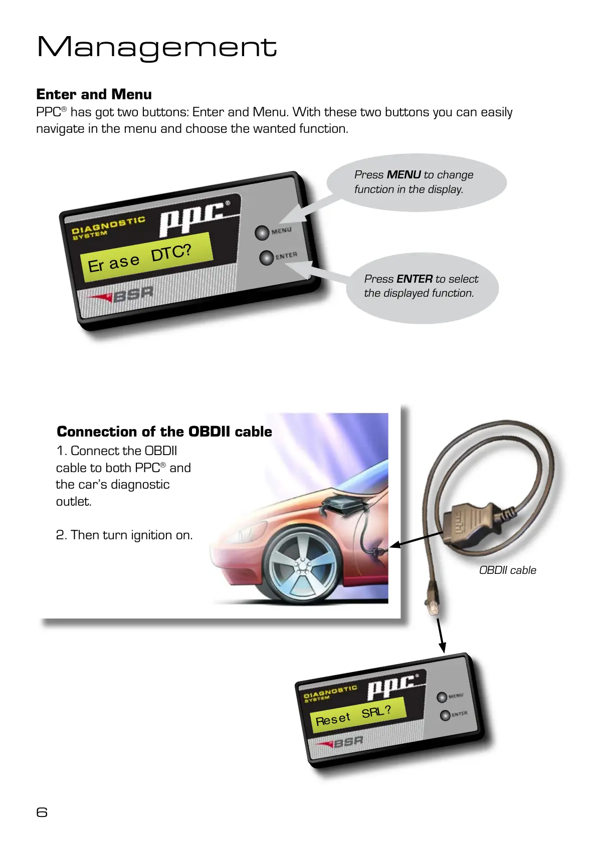 BSR PPC - Management; Enter and Menu; Connection of the OBDII cable