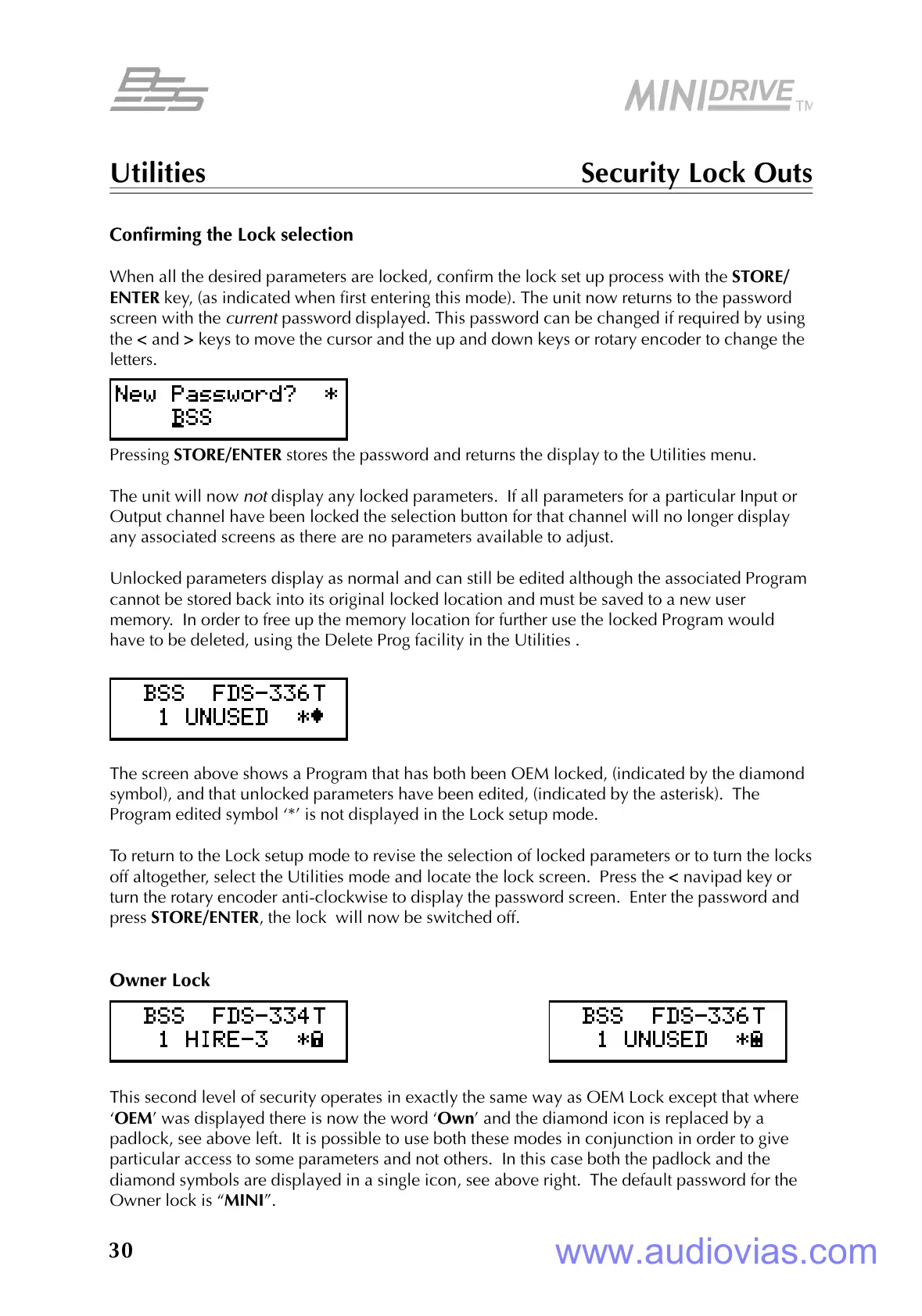 Pressing STORE/ENTER stores the password and returns the display to the Utilities menu.