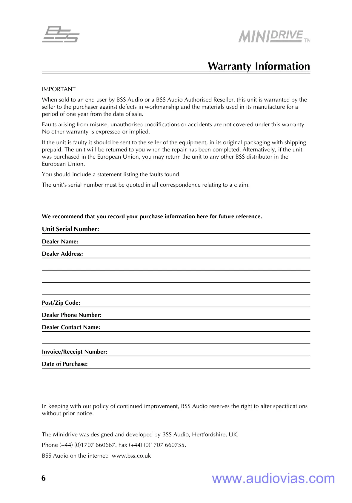 When sold to an end user by BSS Audio or a BSS Audio Authorised Reseller, this unit is warranted by the