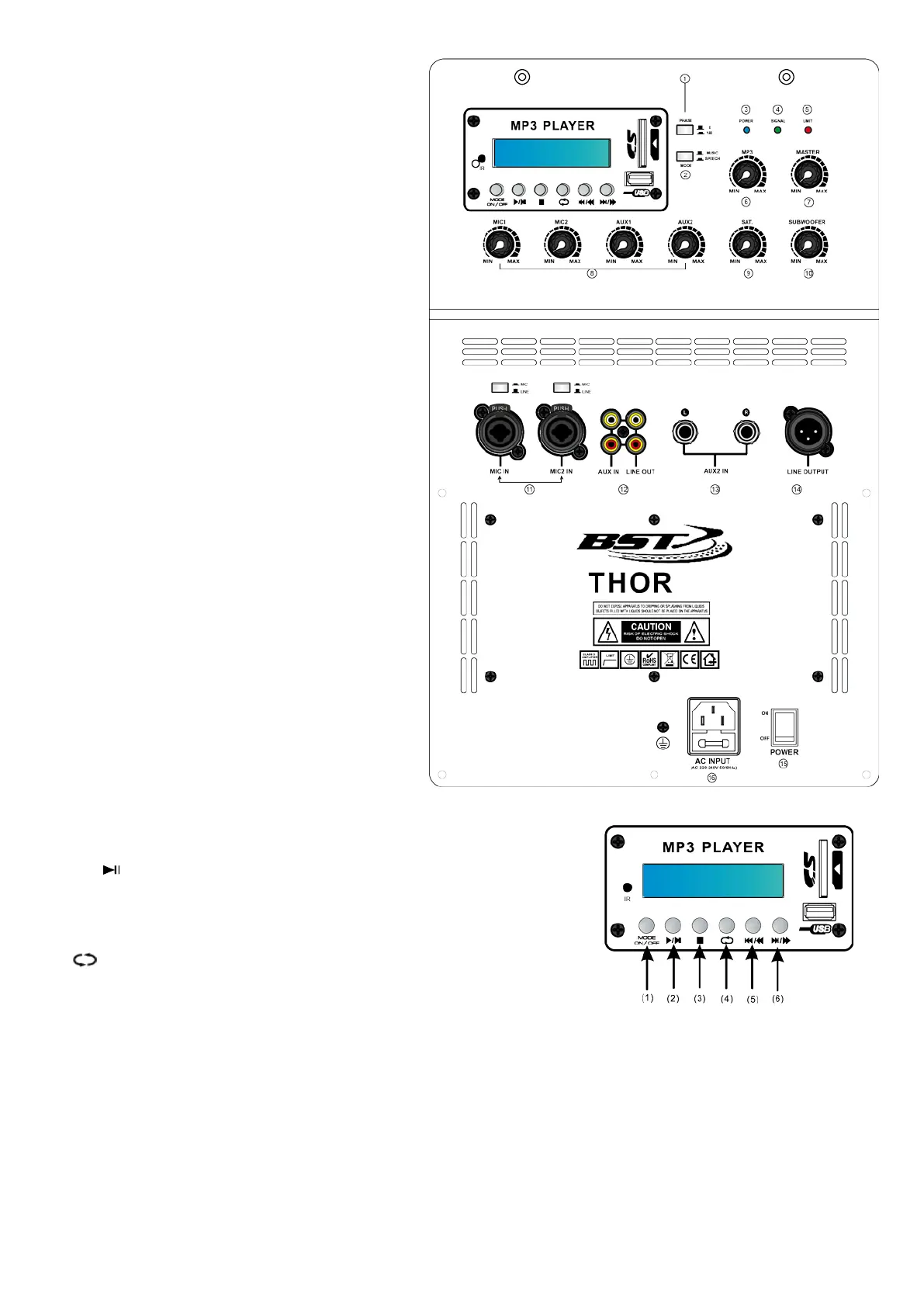1. BETRIEBSARTWAHLSCHALTER: Drücken, um USB/SD/BT Betrieb zu wählen