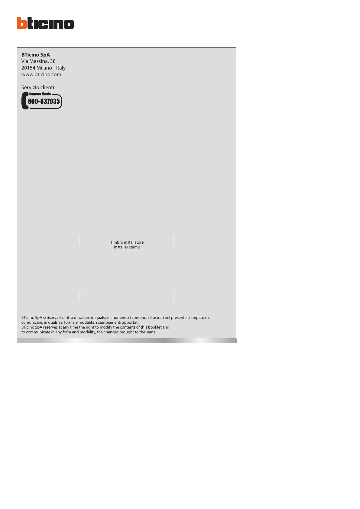 BTicino SpA reserves at any time the right to modify the contents of this booklet and