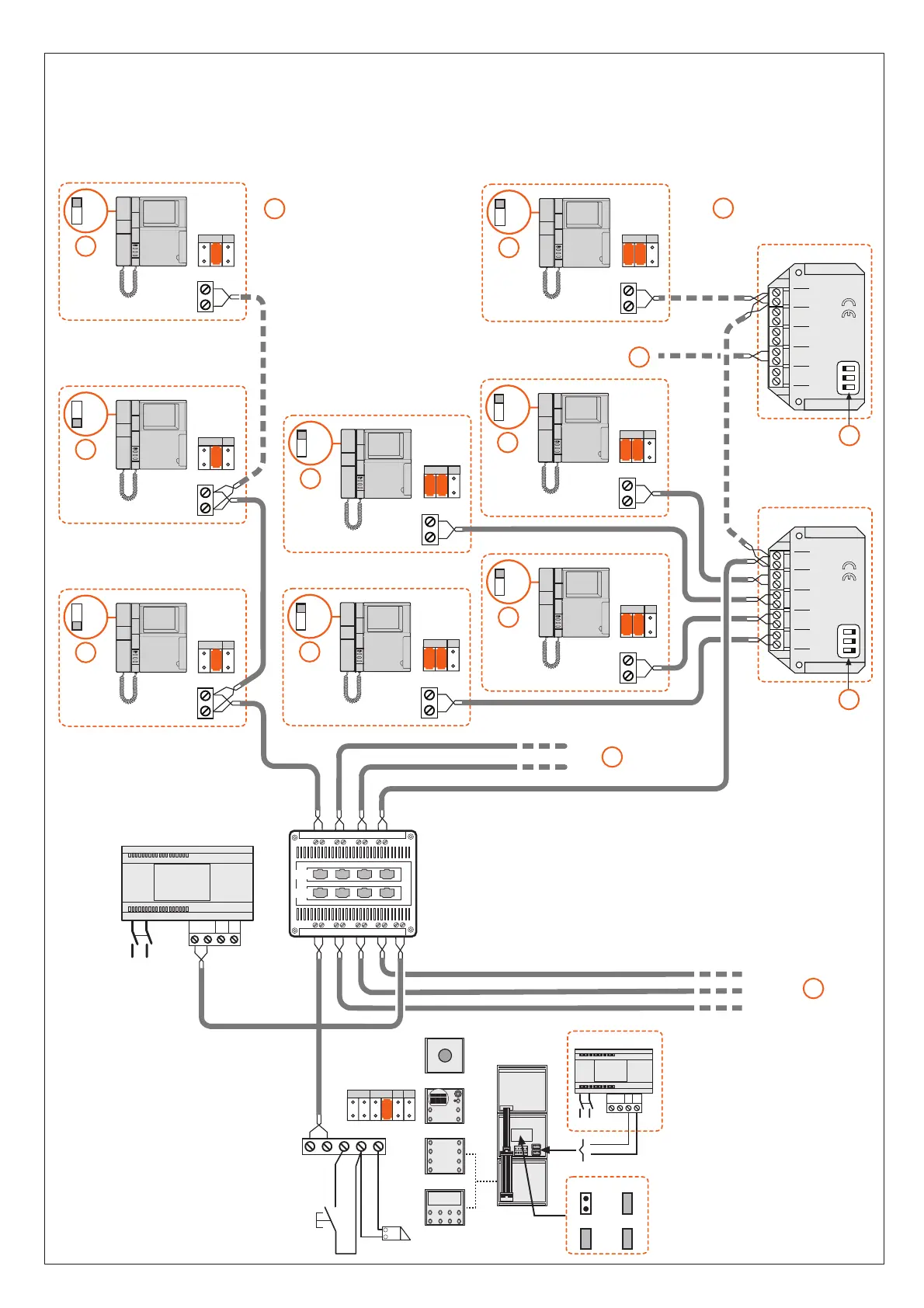 Multi-family system with 4 entrance panels - 64 internal units, 4 extra entrance panels power supply risers.