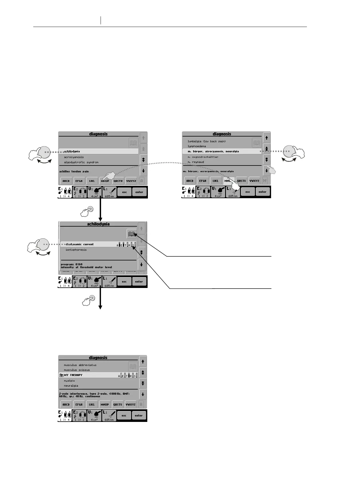 Press the diag (8) button to display a list of therapy protocols / diagnoses. Each channel tab has its own list of therapy