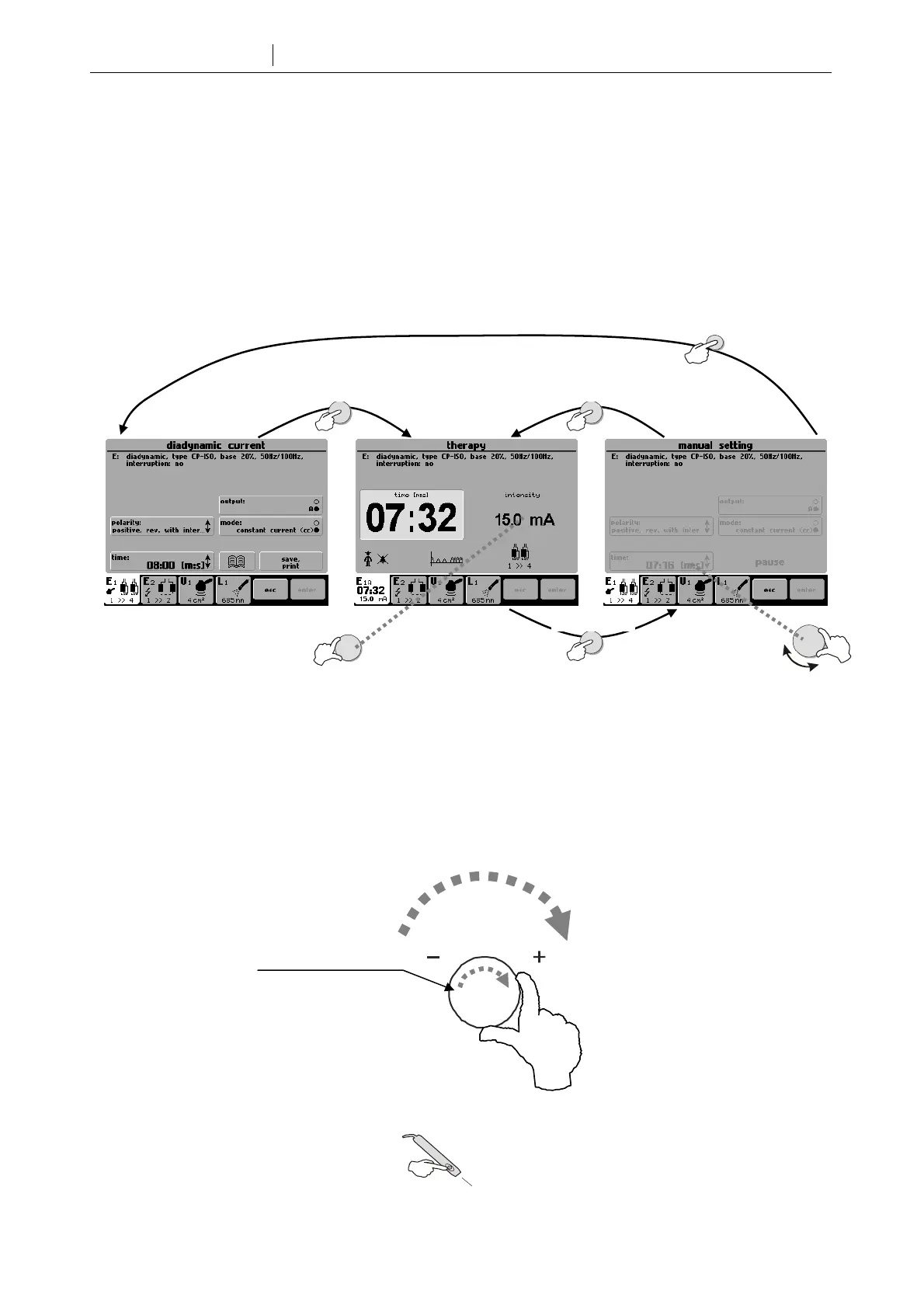 During electrotherapy, you can adjust the intensity during therapy by turning the intensity (18) knob to the right (to