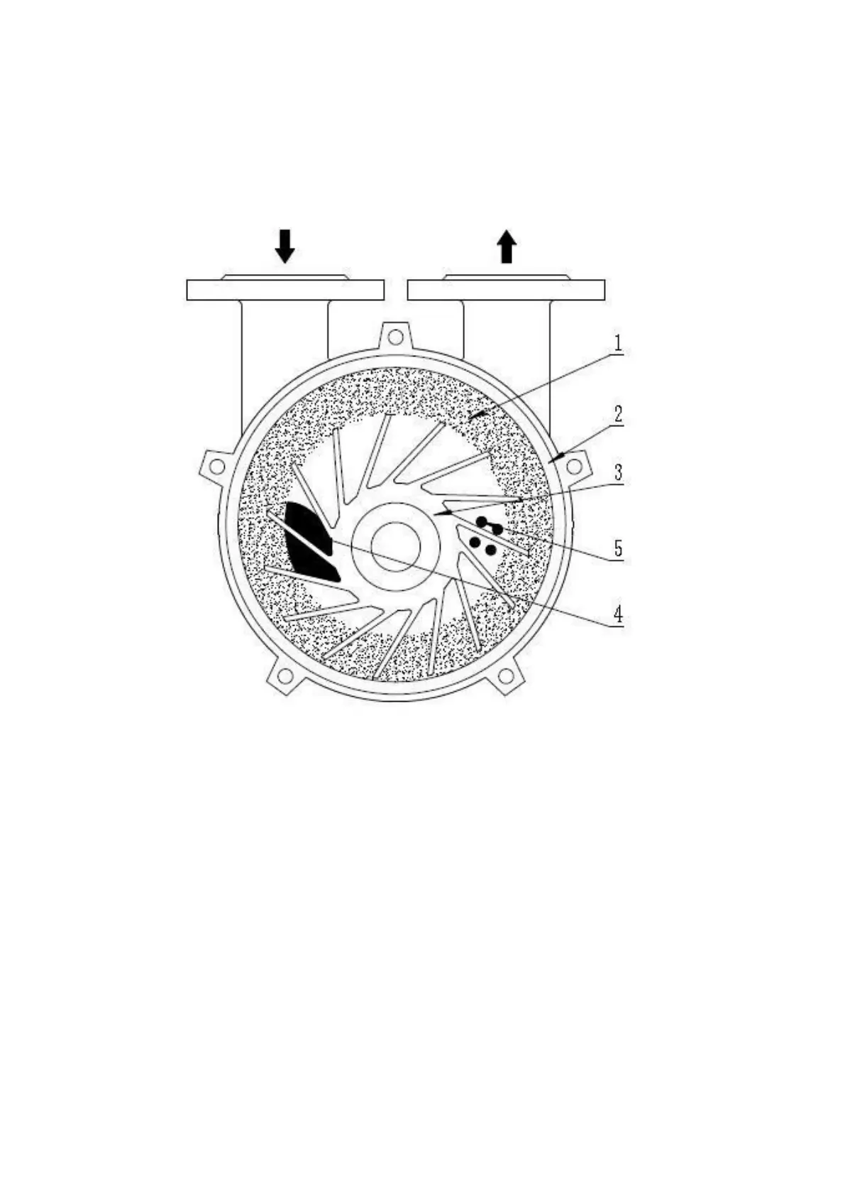 1) Arbeitsflüssigkeitsring; 2) Arbeitskammerwand; 3) Laufrad; 4) Lufteinlass; 5) Luftauslass.