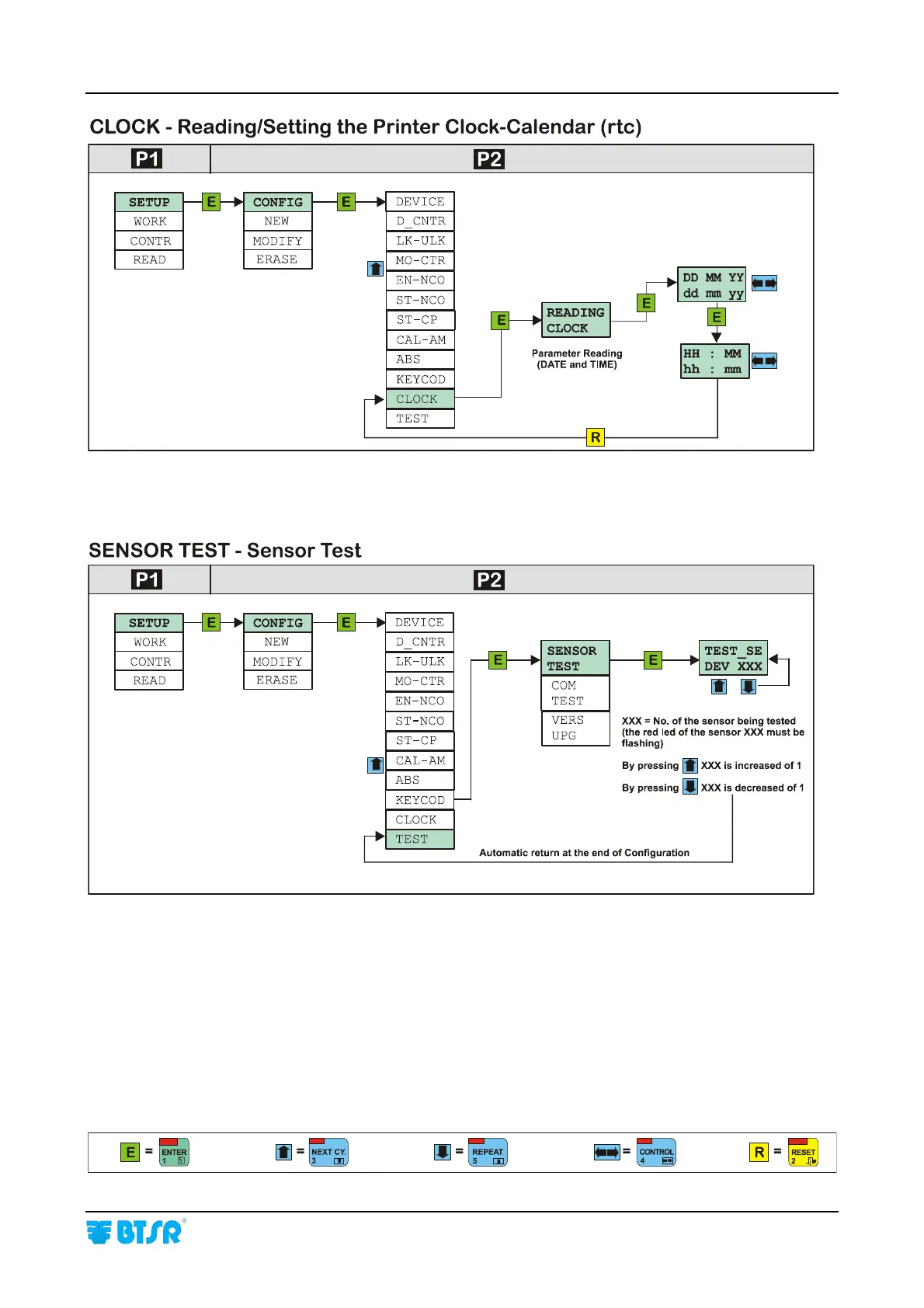 btsr SMART CLEARER - CLOCK - Reading;Setting the Printer Clock-Calendar (rtc); SENSOR TEST - Sensor Test