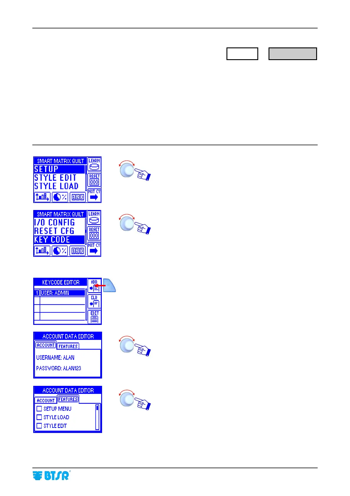 (*) User name and password can be set character by character turning the selector and clicking to confirm