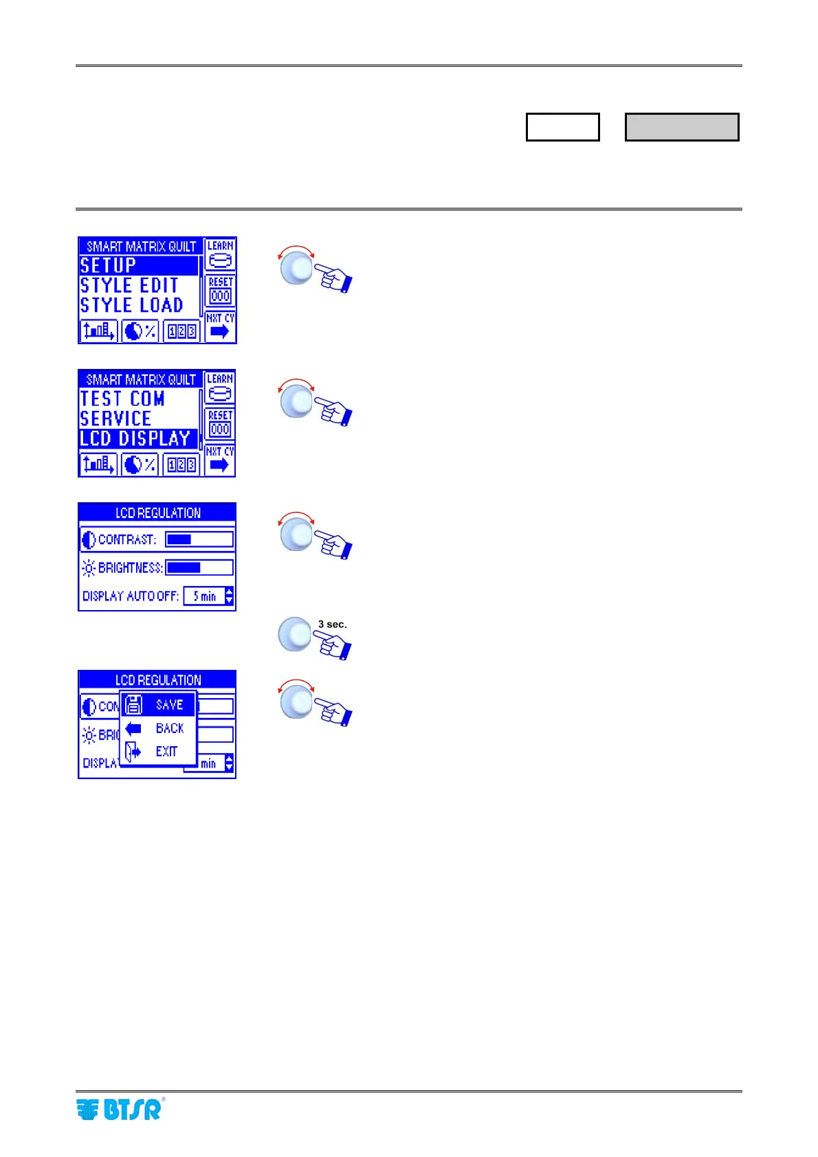 This function allows you to adjust the brightness and contrast of display and to set the display auto-off time