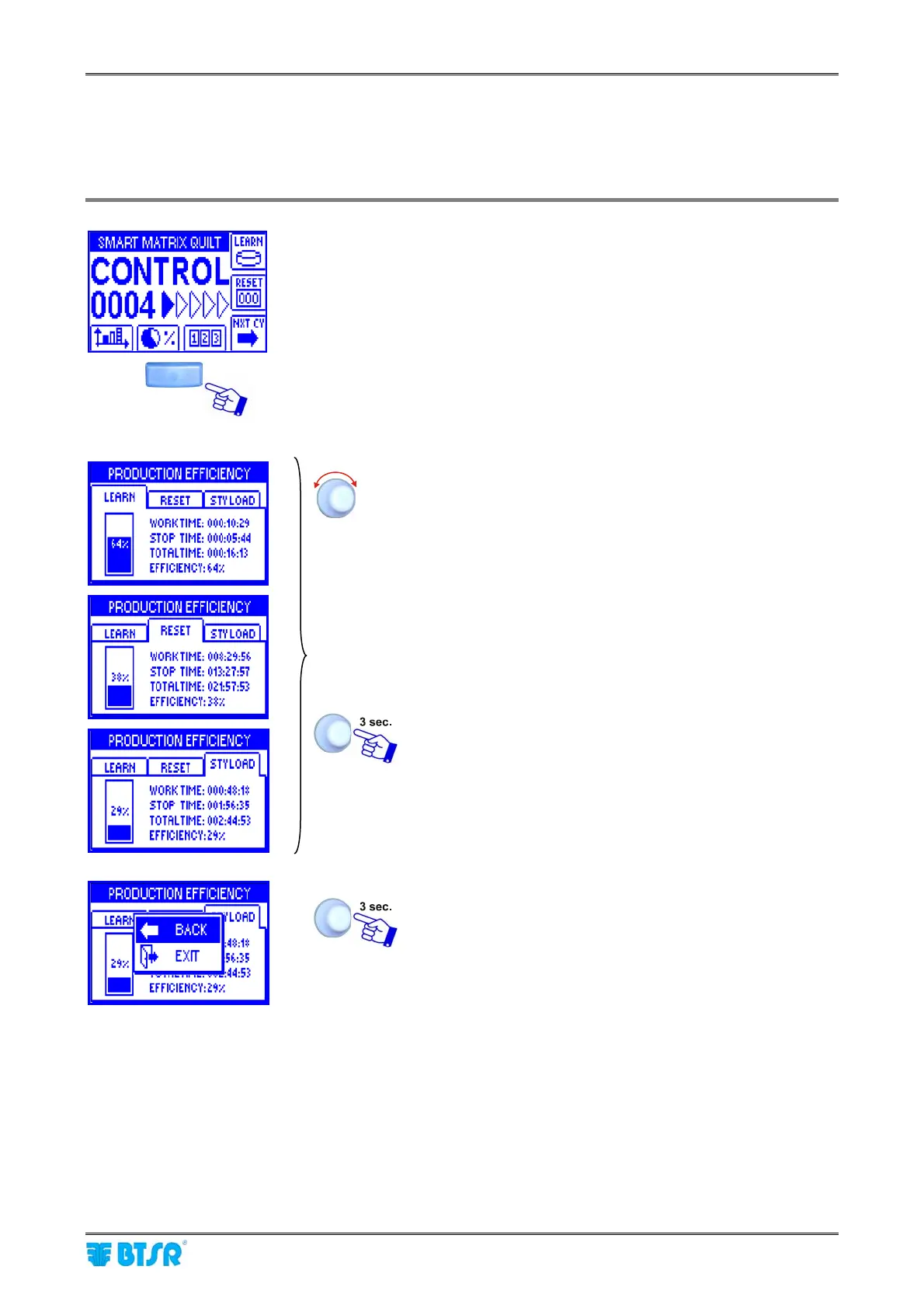 This function allows you to display the production efficiency values (work time, stop time, total time and