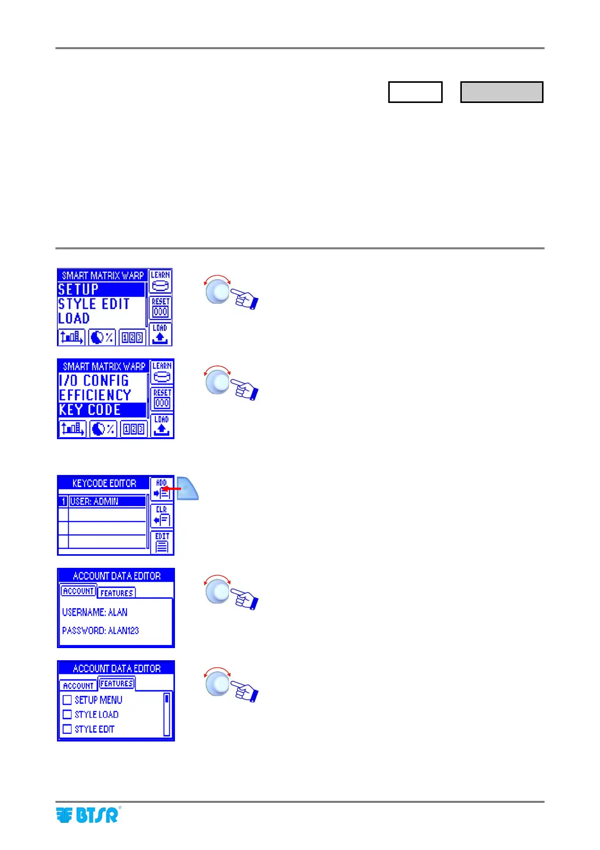(*) User name and password can be set character by character turning the selector and clicking to confirm