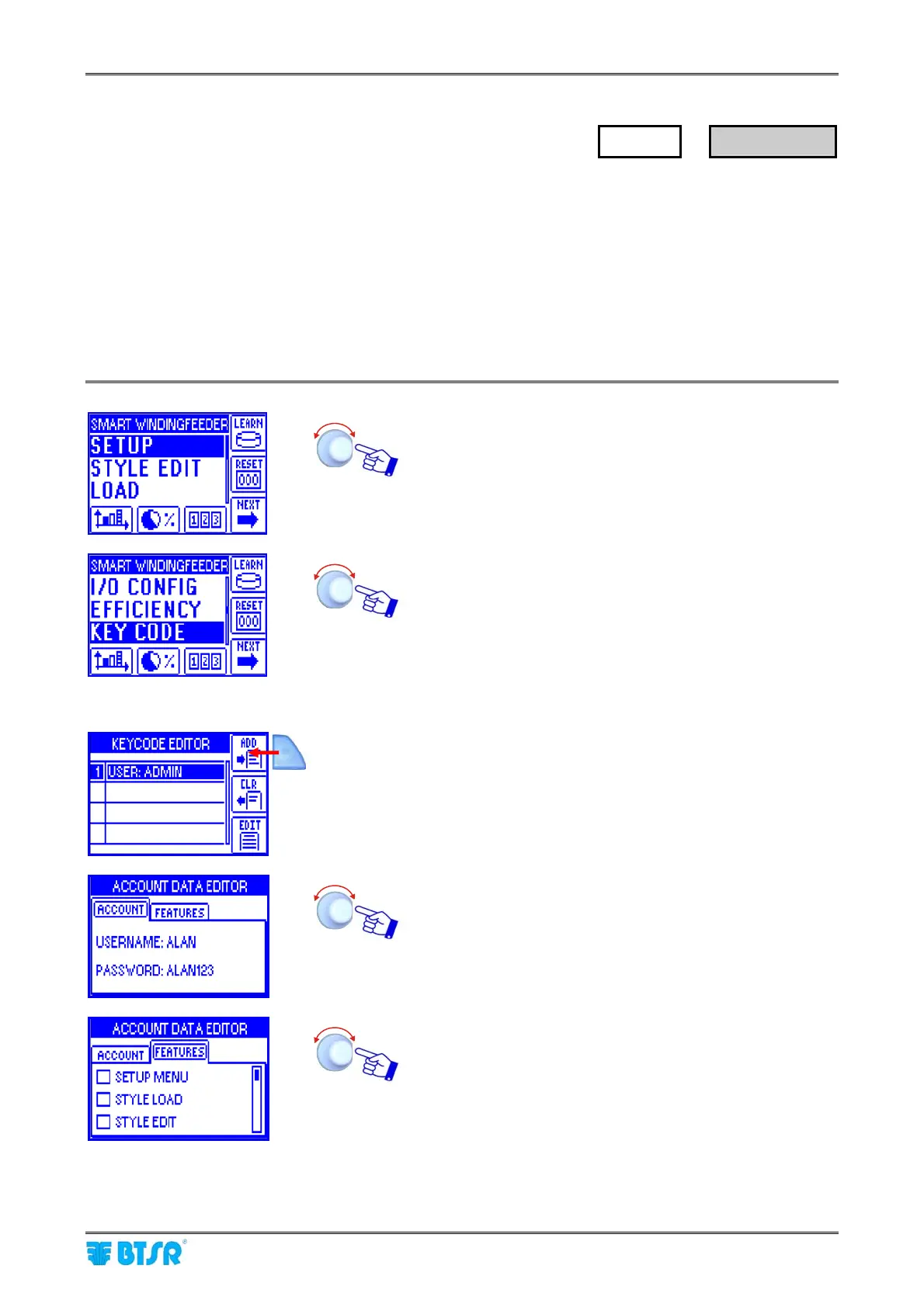 (*) User name and password can be set character by character turning the selector and clicking to confirm