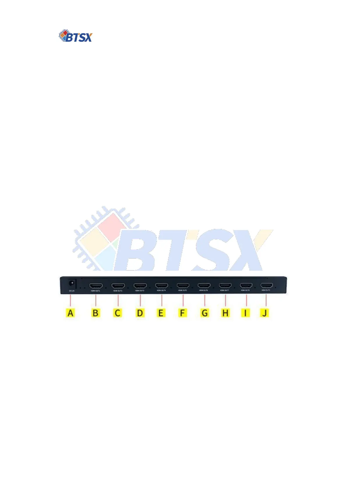 B, C, D, E, F, G, H, I, J: 9 HDMI output interfaces, used to connect display devices