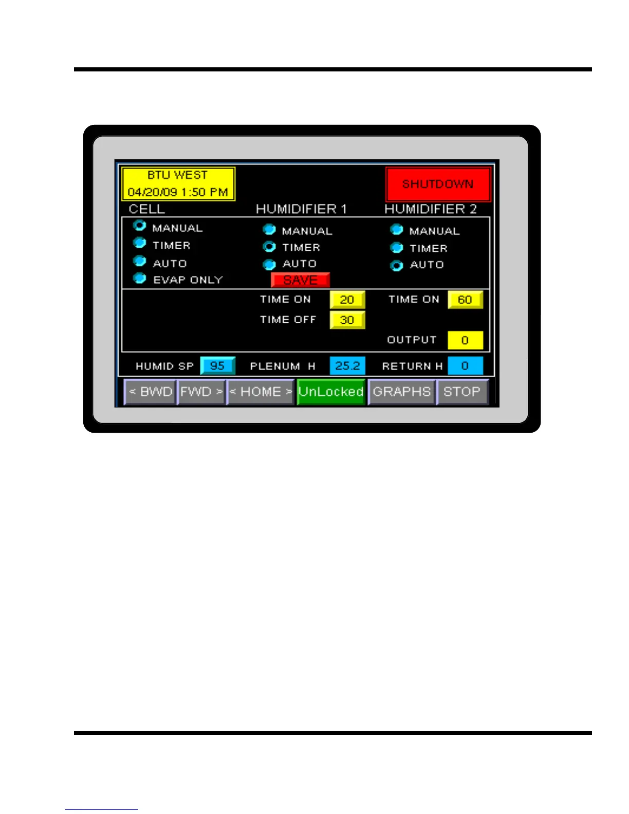 The HUMIDITY CONTROL screen allows the user to make adjustments to the humidity control. Caution: it is