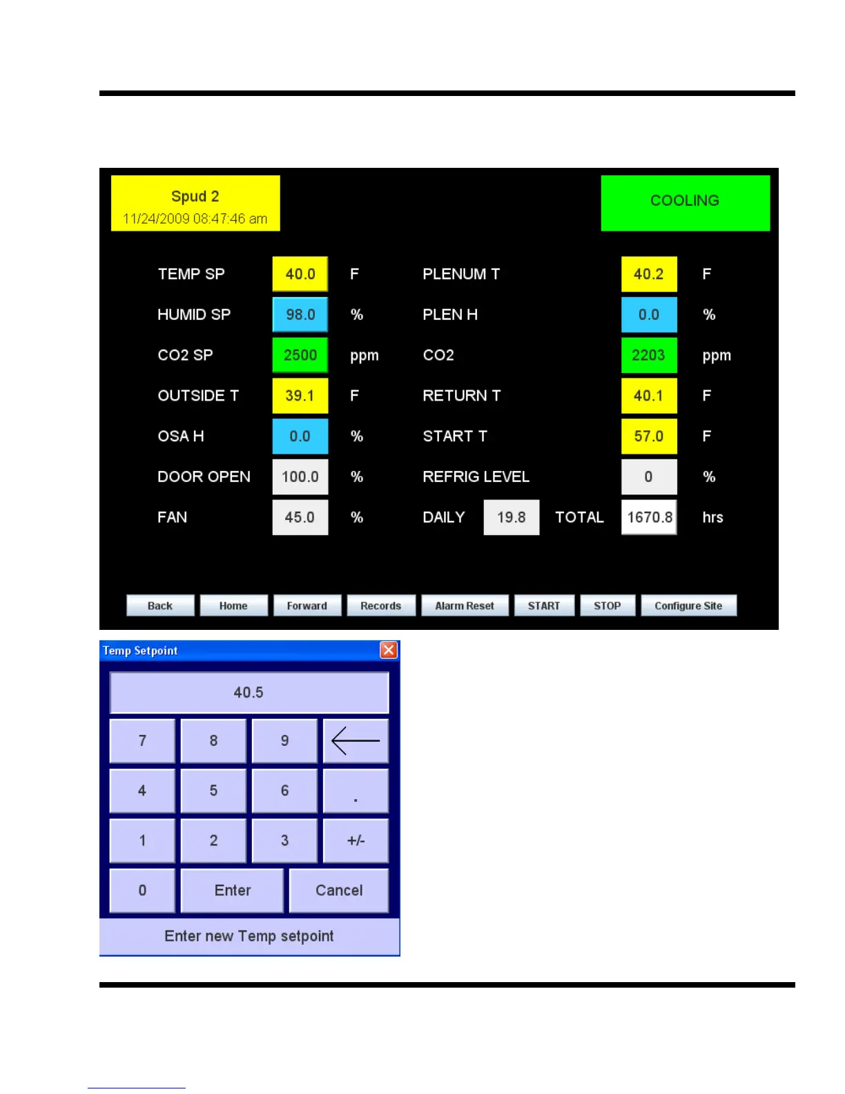 of the HMI screens. To change the Temp SP, click on the yellow box and a key pad will be displayed.