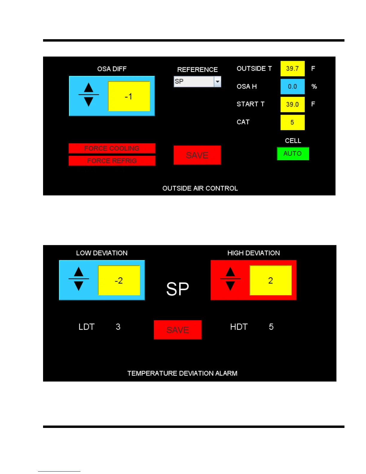 The OUTSIDE AIR CONTROL screen allows for the setting of the outside air differential and the reference.