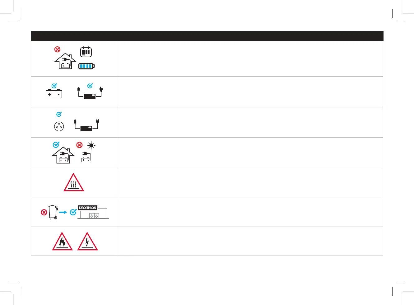 Ne jetez pas la batterie dans des conteneurs non appropriés. Rapportez la batterie usagée dans votre magasin Decathlon pour son recyclage.