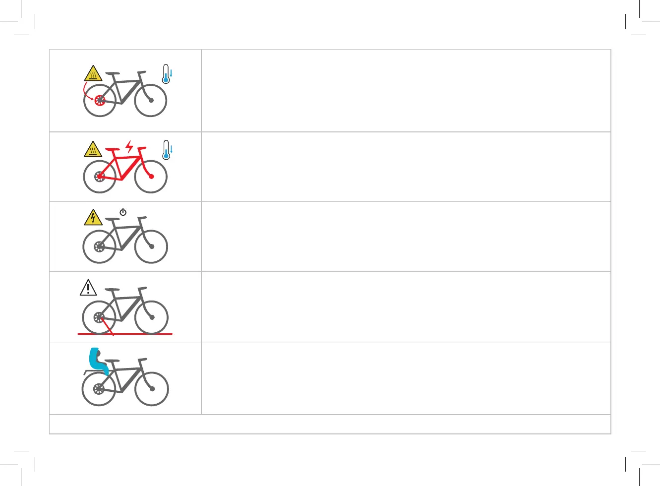 I componenti elettrici (batteria, motore, display, controller, caricabatterie) possono surriscaldarsi dopo l’utilizzo della bicicletta. Attenzione, in condizioni