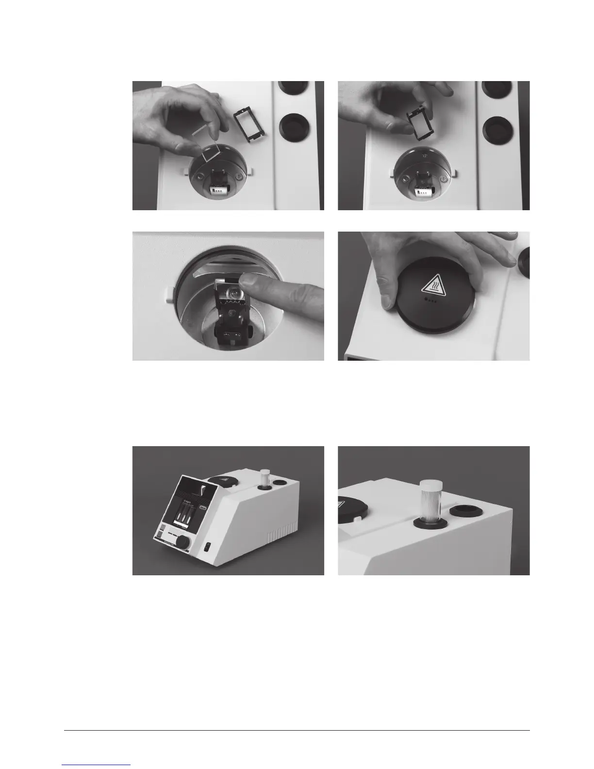 Place the melting point capillaries in the hole of the housing. The second hole is a reservoir for