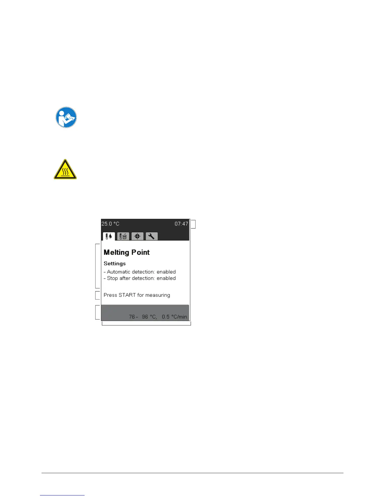 After switching on, the display shows the menu for melting point.