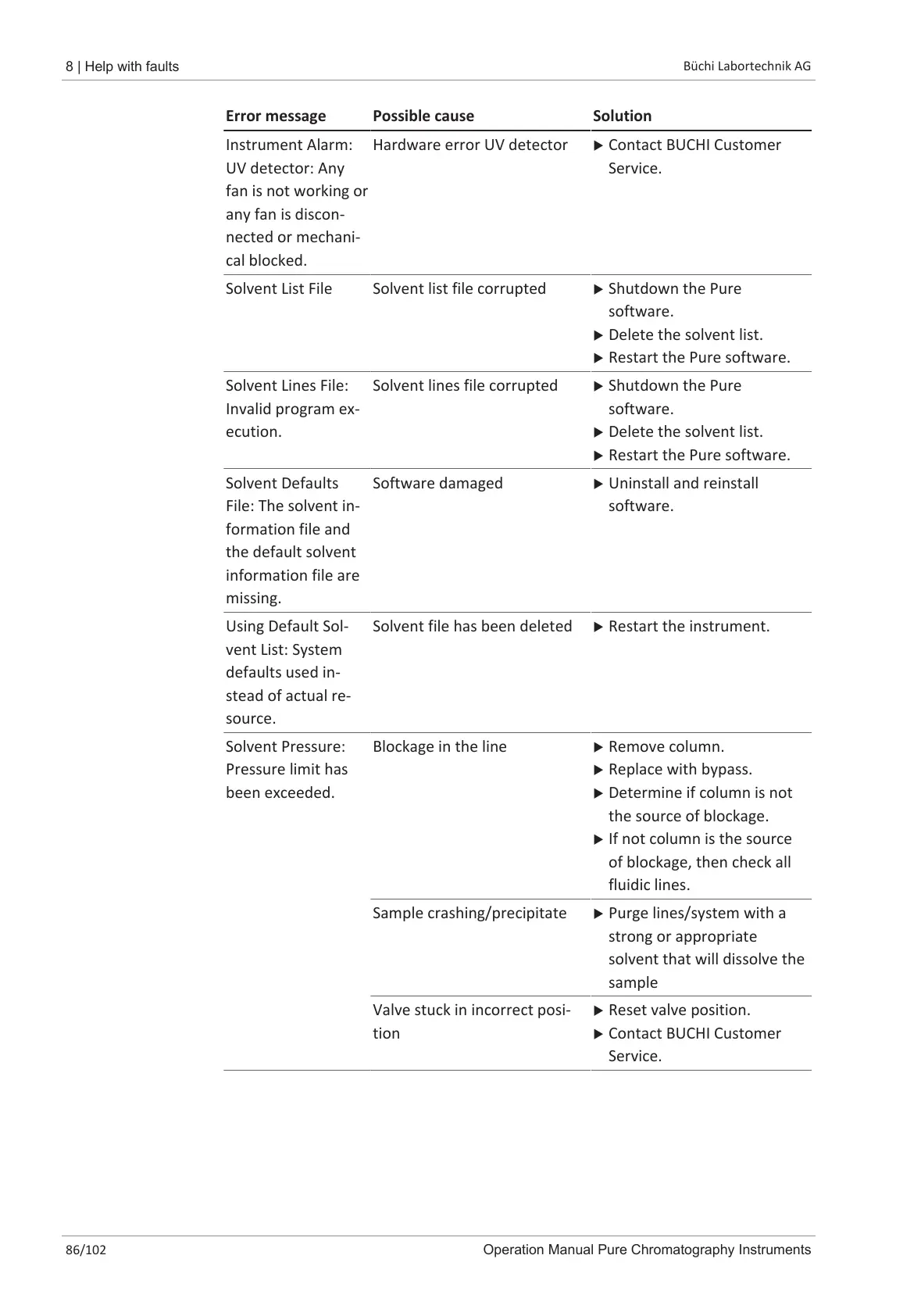 Solvent List File Solvent list file corrupted u Shutdown the Pure