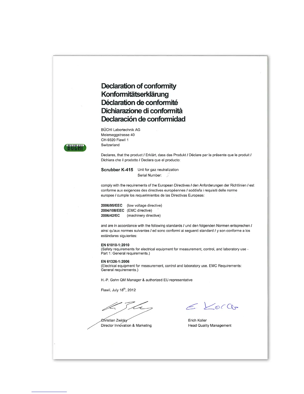 Buchi Scrubber K-415 - Declaration of Conformity
