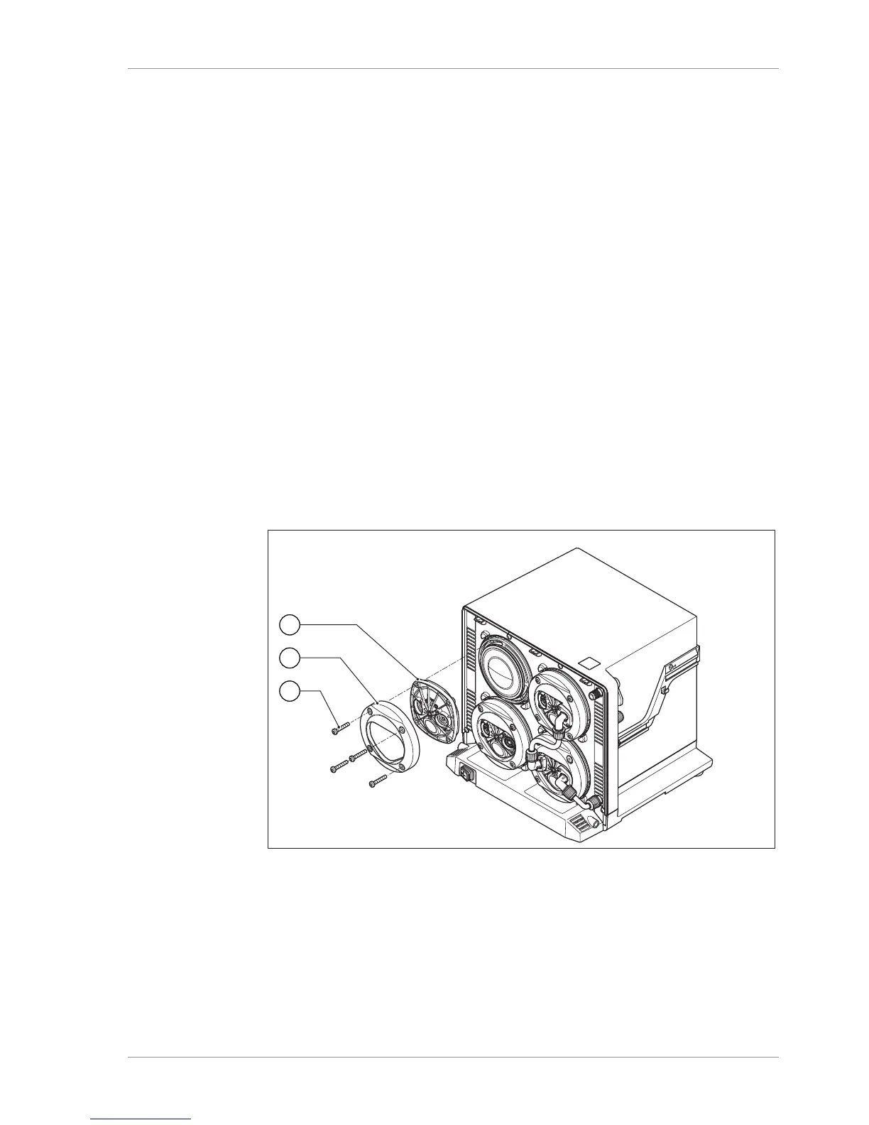 u Unscrew the fixing screws (3) for the elbow connector (2) on the pump head.