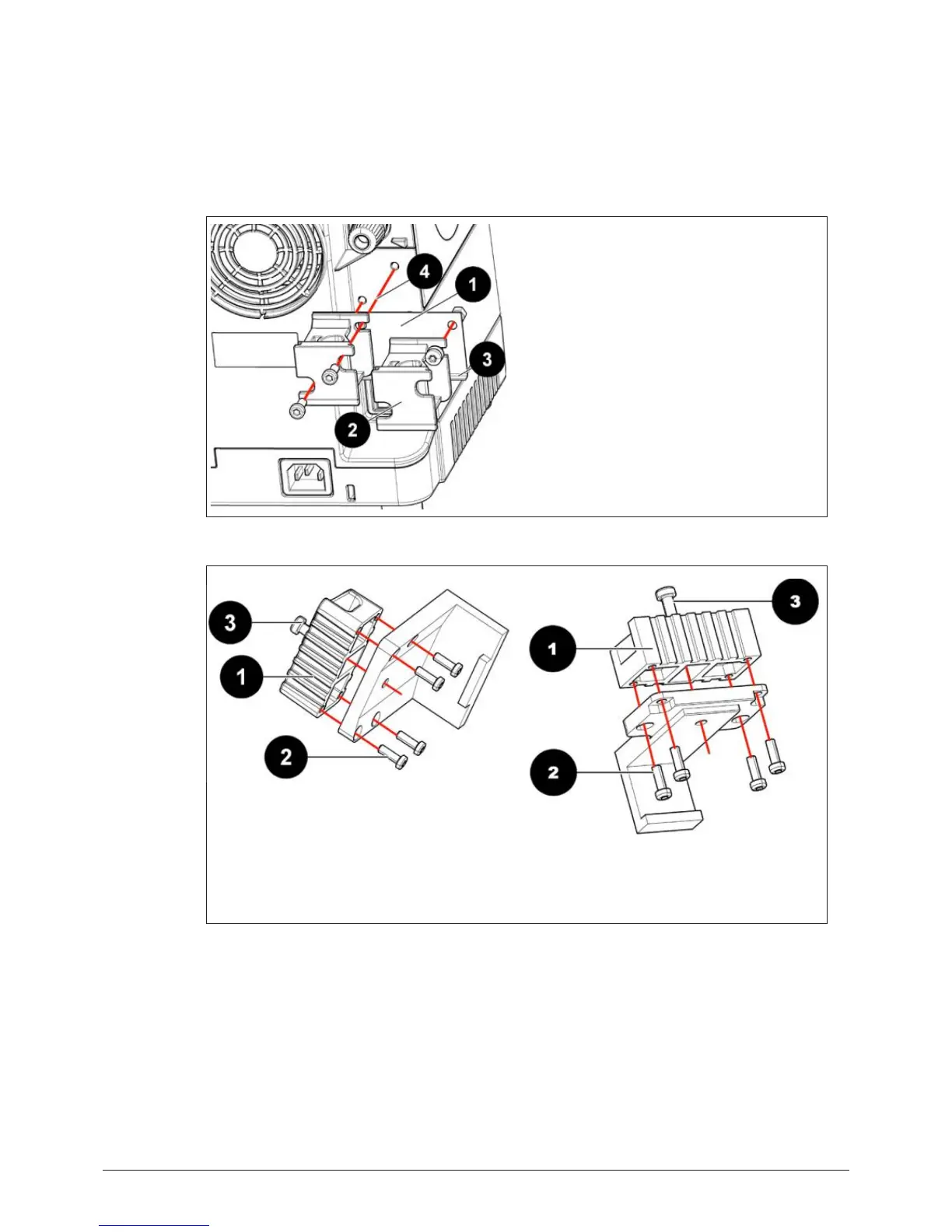 Use the four screws (2) to fix the pump holder onto the controller holder (1). With the long center screw (3) the