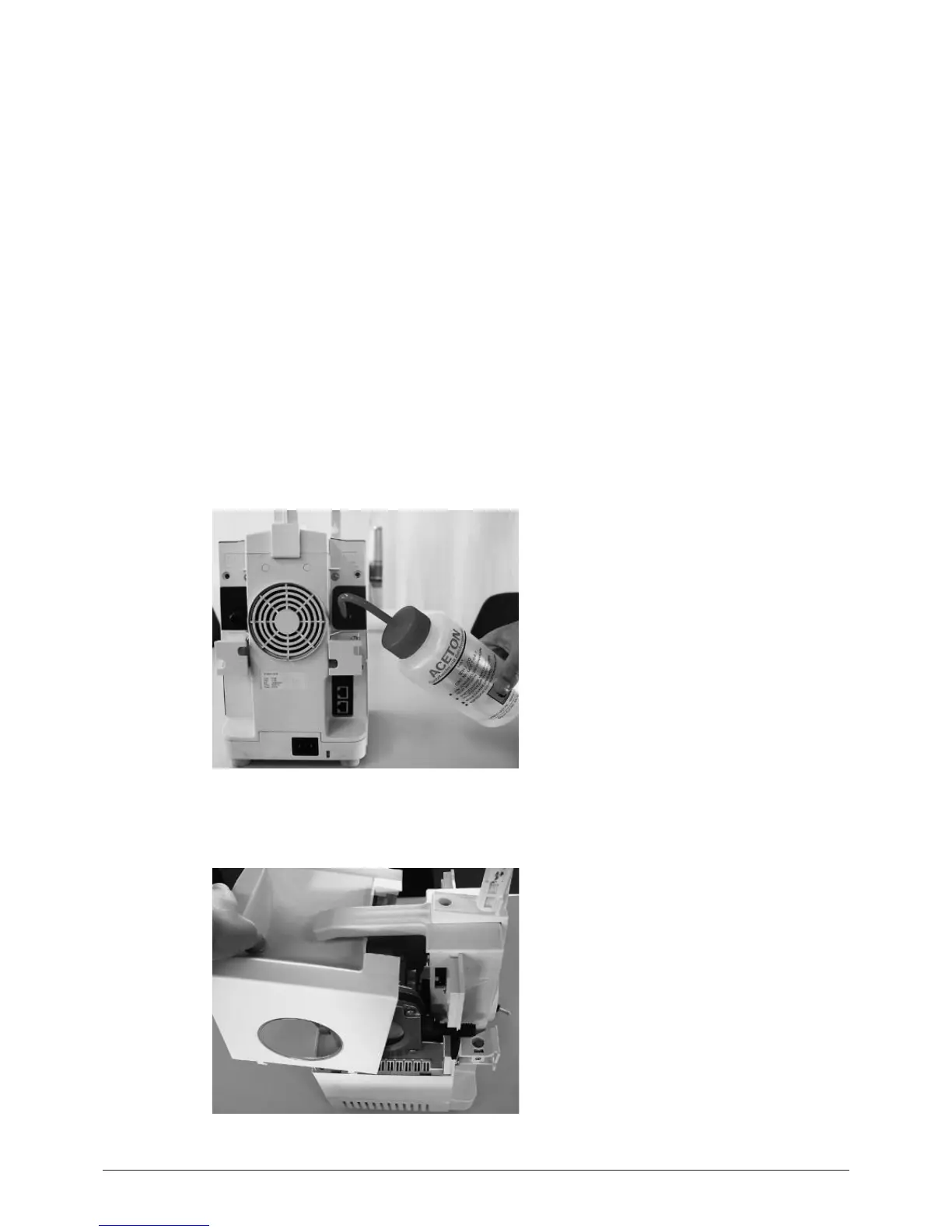 Inject a small amount of about approx. 10 ml of acetone at once into the inlet side of the pump and