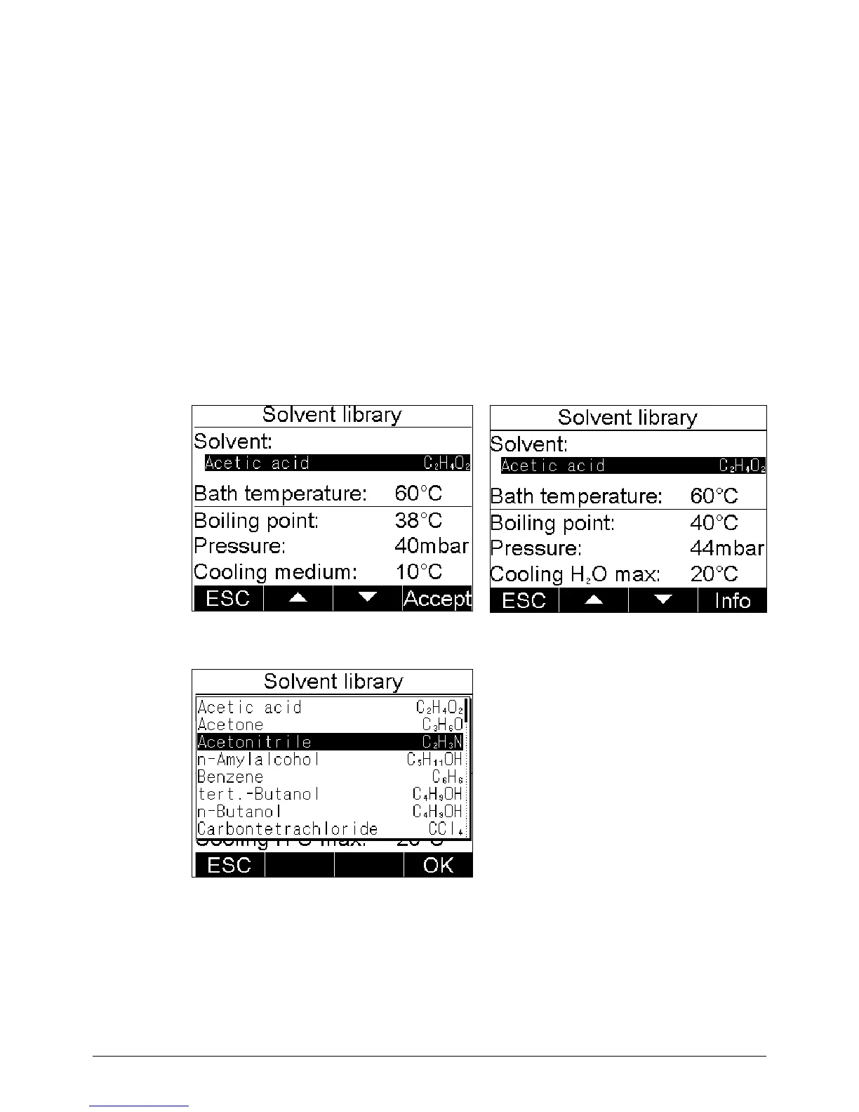 • Press the Library button. The Solvent library screen opens. Some parameters will differ slightly