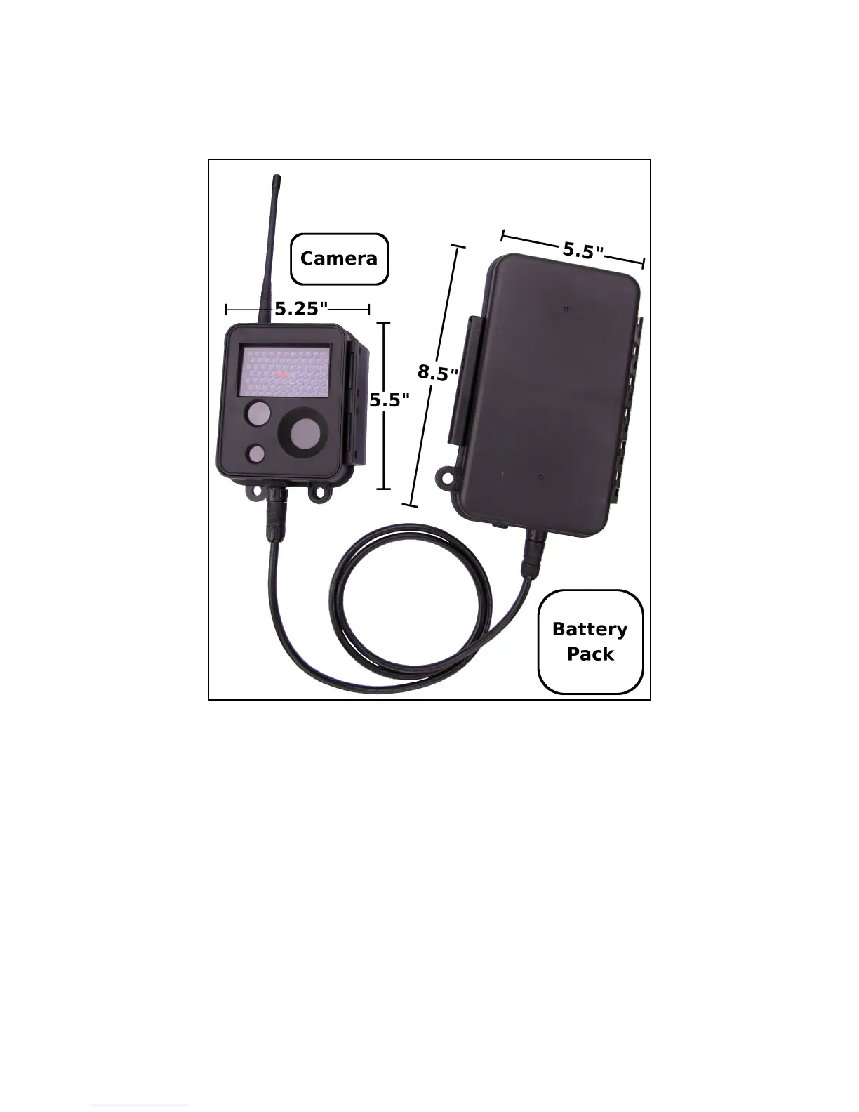 Power is supplied to the camera from an external battery pack. The battery pack contains a 12