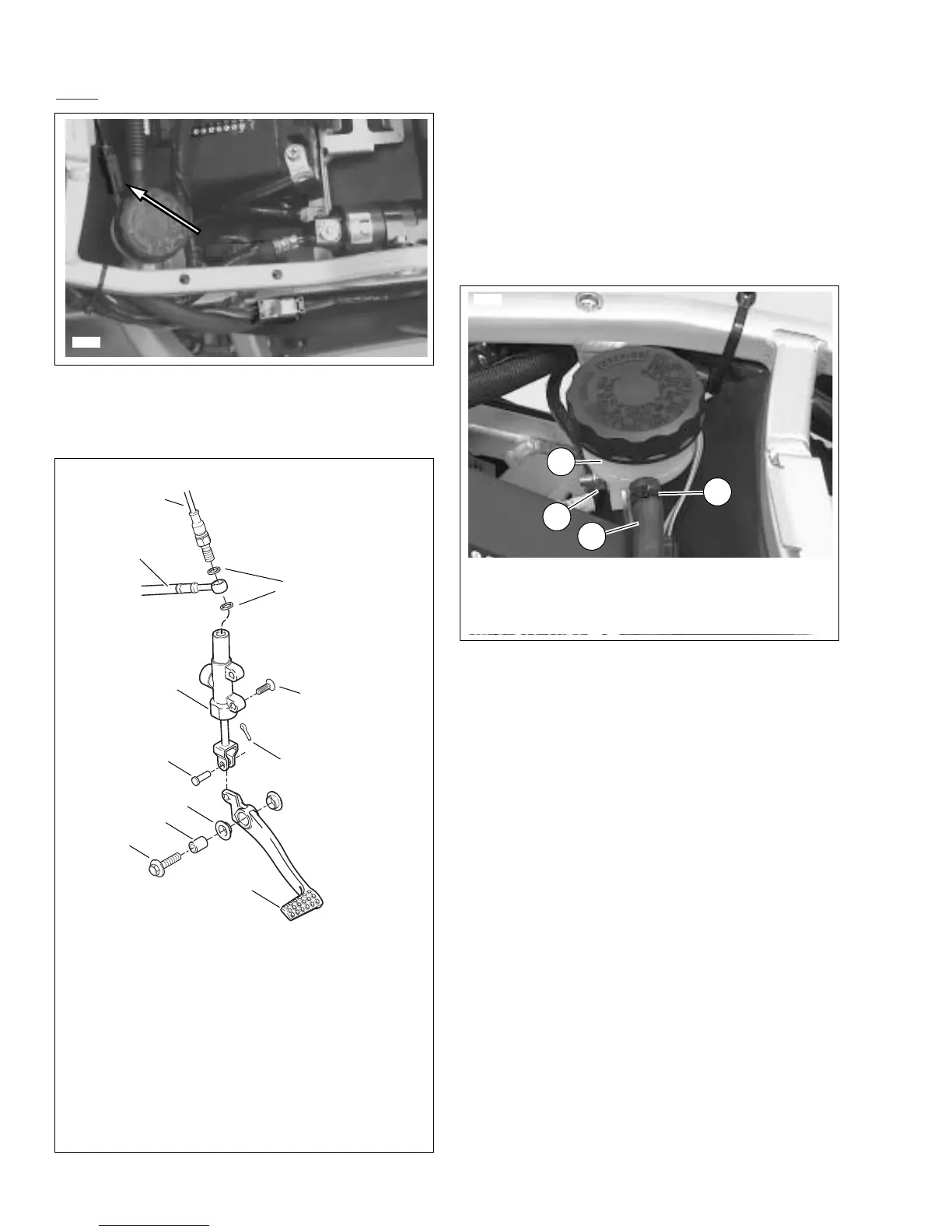 detach master cylinder (4) from rider footpeg mount.