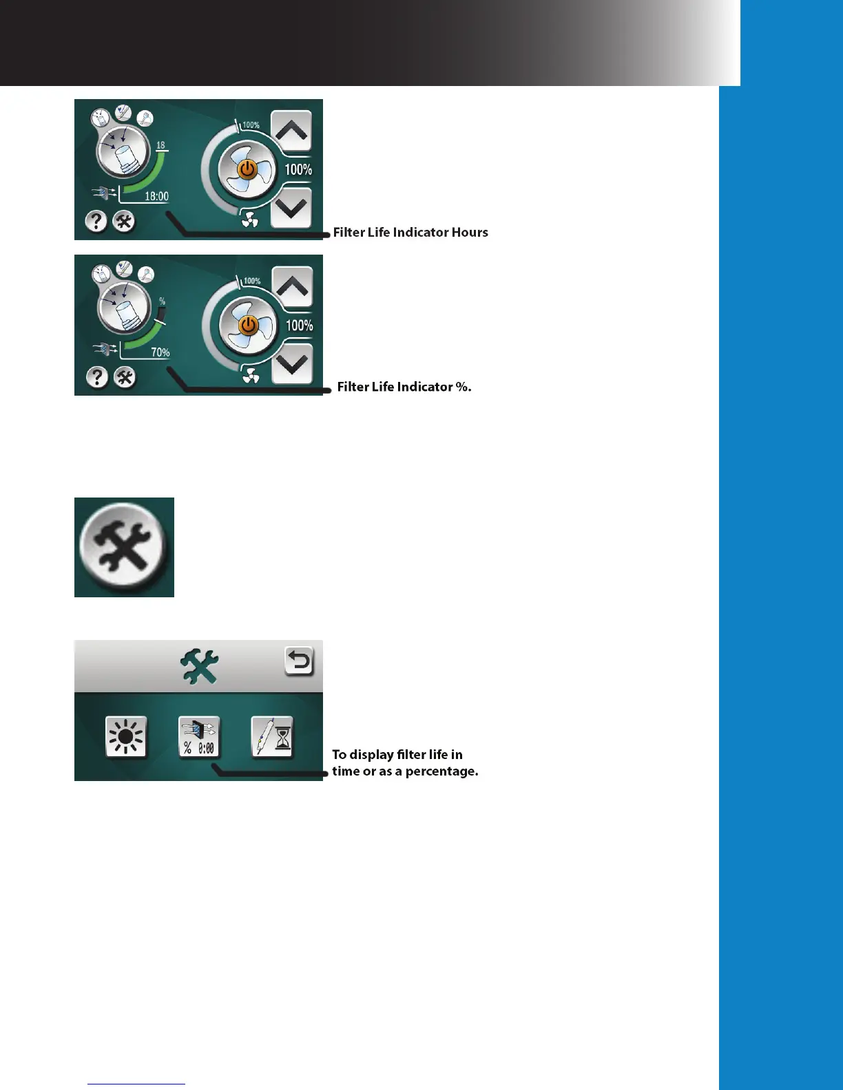 Filter life can be displayed in both hours and minutes or as a percentage using the Settings